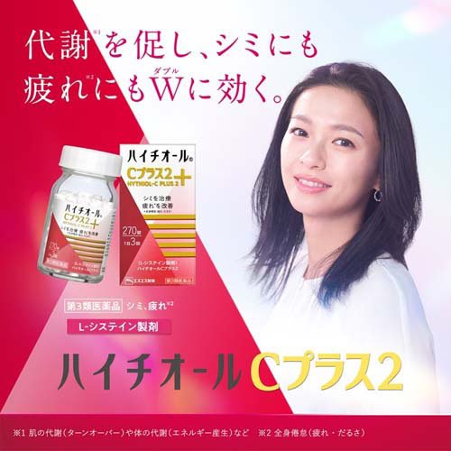 お店TOP>医薬品>皮膚の薬>しみ・そばかす(シミ・ソバカス)>しみ・そばかすの薬 錠剤>ハイチオールCプラス2 (270錠入*3箱セット)お一人様1セットまで。医薬品に関する注意文言【医薬品の使用期限】使用期限120日以上の商品を販売しております商品区分:第三類医薬品【ハイチオールCプラス2の商品詳細】●L-システイン製剤 代謝を助けるアミノ酸「L-システイン」配合L-システインとは・・・タンパク質を構成するアミノ酸の1つです。皮膚や肝臓に多く存在し、さまざまな代謝に関与することで、体の健康に大切な働きをしています。●肌の代謝(ターンオーバー)を助け、シミ・そばかすを治します。ハイチオールCプラス2は・肌の代謝を助け、過剰にできたメラニンをスムーズに排出・シミの原因となる過剰な黒色メラニンの生成を抑制・肌に沈着してしまった黒色メラニンを無色化することで、シミ・そばかすを治します。●体の代謝(エネルギー産生)を助け、疲れ・だるさ(全身倦怠)を改善します。体の代謝が滞ると、エネルギーが効率よく産生できず、疲れやだるさを感じるようになります。ハイチオールCプラス2は、栄養素をエネルギーに変換する酵素の働きを助け、体内エネルギーの産生をスムーズにすることで疲れやだるさを取り除きます。●二日酔の原因物質の分解を助け、症状を改善します。二日酔の原因は、アルコールを代謝する過程で生成されるアセトアルデヒドという物質です。ハイチオールCプラス2は、アセトアルデヒドの分解を助け、二日酔の症状を改善します。【効能 効果】しみ・そばかす・日やけなどの色素沈着症全身倦怠二日酔にきび、湿疹、じんましん、かぶれ、くすりまけ【用法 用量】次の1回量を1日3回、水又はぬるま湯で服用してください。(年齢:1回量)成人(15才以上):2錠7才〜14才:1錠7才未満:服用しないこと★用法・用量に関連する注意(1)用法・用量を厳守してください。(2)食前・食後にかかわらず、いつでも服用できます。(3)小児に服用させる場合には、保護者の指導監督のもとに服用させてください。【成分】6錠(成人1日量)中L-システイン:240mgアスコルビン酸(ビタミンC):500mgパントテン酸カルシウム:24mg添加物:無水ケイ酸、セルロース、乳酸Ca、ヒドロキシプロピルセルロース、ヒプロメロース、マクロゴール、D-マンニトール、ジメチルポリシロキサン、二酸化ケイ素、ステアリン酸Ca、タルク、酸化チタン、トウモロコシデンプン、酒石酸、ポリビニルアルコール・アクリル酸・メタクリル酸メチル共重合体※本剤の服用により、尿及び大便の検査値が影響を受けることがあります。医師の検査を受ける場合は、ビタミンCを服用していることを医師にお知らせください。【注意事項】★使用上の注意・相談すること(1)服用後、次の症状があらわれた場合は副作用の可能性があるので、直ちに服用を中止し、添付文書を持って医師、薬剤師又は登録販売者に相談してください(関係部位:症状)皮膚:発疹消化器:吐き気・嘔吐・腹痛(2)服用後、次の症状があらわれることがあるので、このような症状の持続又は増強が見られた場合には、服用を中止し、添付文書を持って医師、薬剤師又は登録販売者に相談してください下痢(3)しばらく服用しても症状がよくならない場合は服用を中止し、添付文書を持って医師、薬剤師又は登録販売者に相談してください★保管及び取扱い上の注意(1)直射日光の当たらない湿気の少ない涼しい所に保管してください。(2)小児の手の届かない所に保管してください。(3)他の容器に入れ替えないでください。(誤用の原因になったり品質が変わることがあります。)(4)ビンのフタはよくしめてください。しめ方が不十分ですと湿気などのため変質することがあります。また、本剤をぬれた手で扱わないでください。(5)ビンの中のつめ物は、輸送中に錠剤が破損するのを防ぐためのものです。開封後は不要となりますので取り除いてください。(6)使用期限のすぎたものは服用しないでください。【医薬品販売について】1.医薬品については、ギフトのご注文はお受けできません。2.医薬品の同一商品のご注文は、数量制限をさせていただいております。ご注文いただいた数量が、当社規定の制限を越えた場合には、薬剤師、登録販売者からご使用状況確認の連絡をさせていただきます。予めご了承ください。3.効能・効果、成分内容等をご確認いただくようお願いします。4.ご使用にあたっては、用法・用量を必ず、ご確認ください。5.医薬品のご使用については、商品の箱に記載または箱の中に添付されている「使用上の注意」を必ずお読みください。6.アレルギー体質の方、妊娠中の方等は、かかりつけの医師にご相談の上、ご購入ください。7.医薬品の使用等に関するお問い合わせは、当社薬剤師がお受けいたします。TEL:050-5577-5042email:kenkocom_4@shop.rakuten.co.jp【原産国】日本【ブランド】ハイチオール【発売元、製造元、輸入元又は販売元】エスエス製薬※説明文は単品の内容です。リ
