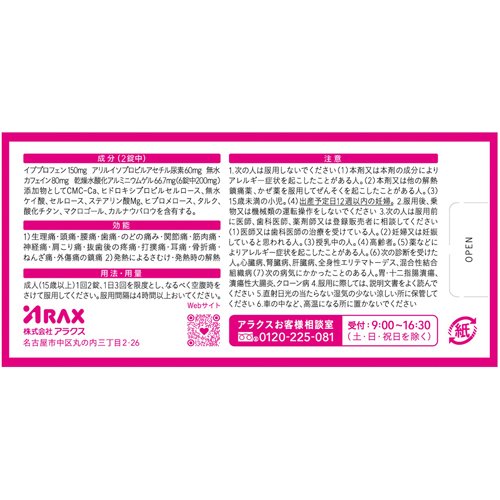 お店TOP>医薬品>風邪薬>解熱鎮痛剤>解熱鎮痛剤 錠剤>オトナ ノーシン ピュア (24錠*3箱セット(セルフメディケーション税制対象))お一人様1セットまで。医薬品に関する注意文言この医薬品は指定第2類医薬品です。小児、高齢者他、禁忌事項に該当する場合は、重篤な副作用が発生する恐れがあります。詳しくは、薬剤師または登録販売者までご相談ください。【医薬品の使用期限】使用期限120日以上の商品を販売しております商品区分:指定第二類医薬品【オトナ ノーシン ピュアの商品詳細】●生理痛・頭痛に●解熱鎮痛薬●速くよく効く 3つの有効成分を配合( ・イブプロフェン ・アリルイソプロピルアセチル尿素 ・無水カフェイン)+●胃にやさしい(乾燥水酸化アルミニウムゲル配合)●小粒でのみやすい(フィルムコーティング錠)【販売名】オトナノーシンピュア【効能 効果】1)生理痛・頭痛・腰痛・歯痛・のどの痛み・関節痛・筋肉痛・神経痛・肩こり痛・抜歯後の疼痛・打撲痛・耳痛・骨折痛・ねんざ痛・外傷痛の鎮痛2)発熱によるさむけ・発熱時の解熱【用法 用量】次の用量をなるべく空腹時をさけて服用してください。服用間隔は4時間以上おいてください。年齢/1回量/1日服用回数成人(15歳以上)/2錠/3回を限度とする15歳未満の小児/服用しないこと★用法・用量に関連する注意(1)定められた用法・用量を厳守してください。(2) 錠剤の取り出し方錠剤の入っているPTPシートの凸部を指先で強く押して裏面のアルミ箔を破り、取り出して服用してください。(誤ってそのままのみ込んだりすると食道粘膜に突き刺さる等思わぬ事故につながります。)【成分】成分/2錠(1回量)中イブプロフェン/150mgアリルイソプロピルアセチル尿素/60mg 無水カフェイン/80mg 乾燥水酸化アルミニウムゲル/66.7mg(6錠(1日量)中200mg) 添加物としてCMC-Ca、ヒドロキシプロピルセルロース、無水ケイ酸、セルロース、ステアリン酸Mg、ヒプロメロース、タルク、酸化チタン、マクロゴール、カルナウバロウを含有する。【注意事項】★使用上の注意・してはいけないこと(守らないと現在の症状が悪化したり、副作用・事故が起こりやすくなります)1.次の人は服用しないでください(1)本剤又は本剤の成分によりアレルギー症状を起こしたことがある人。(2)本剤又は他の解熱鎮痛薬、かぜ薬を服用してぜんそくを起こしたことがある人。(3)15歳未満の小児。(4)出産予定日12週以内の妊婦。2.本剤を服用している間は、次のいずれの医薬品も服用しないでください 他の解熱鎮痛薬、かぜ薬、鎮静薬、乗物酔い薬3.服用後、乗物又は機械類の運転操作をしないでください(眠気等があらわれることがあります。)4.服用前後は飲酒しないでください5.長期連用しないでください・相談すること1.次の人は服用前に医師、歯科医師、薬剤師又は登録販売者に相談してください(1)医師又は歯科医師の治療を受けている人。(2)妊婦又は妊娠していると思われる人。(3)授乳中の人。(4)高齢者。(5)薬などによりアレルギー症状を起こしたことがある人。(6)次の診断を受けた人。心臓病、腎臓病、肝臓病、全身性エリテマトーデス、混合性結合組織病(7)次の病気にかかったことのある人。胃・十二指腸潰瘍、潰瘍性大腸炎、クローン病2.服用後、次の症状があらわれた場合は副作用の可能性があるので、直ちに服用を中止し、この文書を持って医師、歯科医師、薬剤師又は登録販売者に相談してください(関係部位/症状)皮膚/発疹・発赤、かゆみ、青あざができる消化器/吐き気・嘔吐、食欲不振、胃部不快感、胃痛、口内炎、胸やけ、胃もたれ、胃腸出血、腹痛、下痢、血便精神神経系/めまい循環器 /動悸呼吸器/息切れその他/目のかすみ、耳なり、むくみ、鼻血、歯ぐきの出血、出血が止まりにくい、出血、背中の痛み、過度の体温低下、からだがだるいまれに次の重篤な症状が起こることがあります。その場合は直ちに医師の診療を受けてください。(症状の名称)ショック(アナフィラキシー)/皮膚粘膜眼症候群(スティーブンス・ジョンソン症候群)、中毒性表皮壊死融解症/肝機能障害/腎障害/無菌性髄膜炎/ぜんそく/再生不良性貧血/無顆粒球症※具体的な症状については添付文書をご確認ください。3.服用後、次の症状があらわれることがあるので、このような症状の持続又は増強が見られた場合には、服用を中止し、この文書を持って医師、薬剤師又は登録販売者に相談してください便秘、眠気4.5〜6回服用しても症状がよくならない場合は服用を中止し、添付文書を持って医師、歯科医師、薬剤師又は登録販売者に相談してください【医薬品販売について】1.医薬品については、ギフトのご注文はお受けできません。2.医薬品の同一商品のご注文は、数量制限をさせていただいております。ご注文いただいた数量が、当社規定の制限を越えた場合には、薬剤師、登録販売者からご使用状況確認の連絡をさせていただきます。予めご了承ください。3.効能・効果、成分内容等をご確認いただくようお願いし