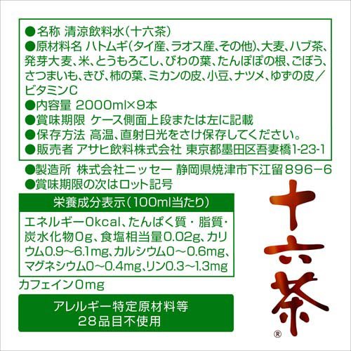 お店TOP>水・飲料>飲料・ソフトドリンク>茶系飲料>ブレンド茶(清涼飲料水)>アサヒ 十六茶 ラベルレス ペットボトル (2L×9本入)【アサヒ 十六茶 ラベルレス ペットボトルの商品詳細】●カラダにいいこと 十六茶おいしさと健康を追求し16素材を絶妙にブレンド。●香ばしくすっきりゴクゴク飲めて、さらに16素材も摂れるカフェインゼロのブレンド茶です。【品名・名称】清涼飲料水(十六茶)【アサヒ 十六茶 ラベルレス ペットボトルの原材料】ハトムギ(タイ産、ラオス産、その他)、大麦、ハブ茶、発芽大麦、米、とうもろこし、びわの葉、たんぽぽの根、ごぼう、さつまいも、きび、柿の葉、ミカンの皮、小豆、ナツメ、ゆずの皮/ビタミンC【栄養成分】(100ml当たり)エネルギー0kcal、たんぱく質0g、脂質0g、炭水化物0g、食塩相当量0.02g、カフェイン0mg【保存方法】高温、直射日光をさけ保存してください。【原産国】日本【ブランド】十六茶【発売元、製造元、輸入元又は販売元】アサヒ飲料リニューアルに伴い、パッケージ・内容等予告なく変更する場合がございます。予めご了承ください。アサヒ飲料130-8602 東京都墨田区吾妻橋1-23-10120-328-124広告文責:楽天グループ株式会社電話:050-5577-5042[お茶/ブランド:十六茶/]