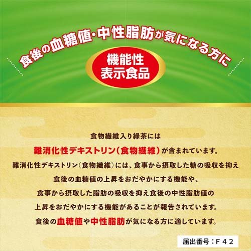 お店TOP>健康食品>機能性表示食品>難消化性デキストリン(機能性表示食品)>日清 食事のおともに 緑茶 食物繊維入り (60本入×2セット(1本7g))商品区分:機能性表示食品(F42)【日清 食事のおともに 緑茶 食物繊維入りの商品詳細】●食後の血糖値や中性脂肪が気になる方の、機能性表示食品の粉末緑茶です。●スティックタイプだから持ち運びにも便利です。【保健機能食品表示】本品には難消化性デキストリン(食物繊維)が含まれます。難消化性デキストリン(食物繊維)には、食事から摂取した糖の吸収を抑え食後の血糖値の上昇をおだやかにする機能や、食事から摂取した脂肪の吸収を抑え食後の中性脂肪値の上昇をおだやかにする機能があることが報告されています。本品は食後の血糖値や中性脂肪が気になる方に適しています。【1日あたりの摂取目安量】1日3本【召し上がり方】1日3回、食事とともに1回1本(7g)をコップ1杯(約100ml)のお湯または水に溶かしてお飲みください。【品名・名称】粉末清涼飲料【日清 食事のおともに 緑茶 食物繊維入りの原材料】難消化性デキストリン(韓国製造)、緑茶エキスパウダー(緑茶(日本)デキストリン)、緑茶/環状オリゴ糖、ビタミンC【栄養成分】3本(21g)当たり熱量:29.5kcal、たんぱく質:0.13g、脂質:0.04g、炭水化物:19.7g(糖質2.9g・食物繊維16.8g)、食塩相当量:0.009〜0.015g機能性関与成分 難消化性デキストリン(食物繊維として):15g【規格概要】内容量:420g(7g*60本)【保存方法】高温多湿を避け、直射日光の当たらない場所に保管してください【注意事項】・本品を多く摂取することにより疾病が治癒するものではありません。・1日あたりの摂取目安量を守ってお飲みください。・摂り過ぎあるいは体質・体調によりお腹がゆるくなることがあります。・本品は、疾病の診断、治療、予防を目的としたものではありません。・本品は、疾病に罹患している者、未成年者、妊産婦(妊娠を計画している者を含む。)及び授乳婦を対象に開発された食品ではありません。・疾病に罹患している場合は医師に、医薬品を服用している場合は医師、薬剤師に相談してください。・体調に異変を感じた際は、速やかに摂取を中止し、医師に相談してください。・本品は、事業者の責任において特定の保健の目的が期待できる旨を表示するものとして、消費者庁長官に届出されたものです。ただし、特定保健用食品と異なり、消費者庁長官による個別審査を受けたものではありません。・食生活は、主食、主菜、副菜を基本に、食事のバランスが重要です。【原産国】日本【発売元、製造元、輸入元又は販売元】日清オイリオグループ※説明文は単品の内容です。リニューアルに伴い、パッケージ・内容等予告なく変更する場合がございます。予めご了承ください。・単品JAN:4902380203230日清オイリオグループ104-8285 東京都中央区新川1-23-10120-016-024広告文責:楽天グループ株式会社電話:050-5577-5042[機能性表示食品]