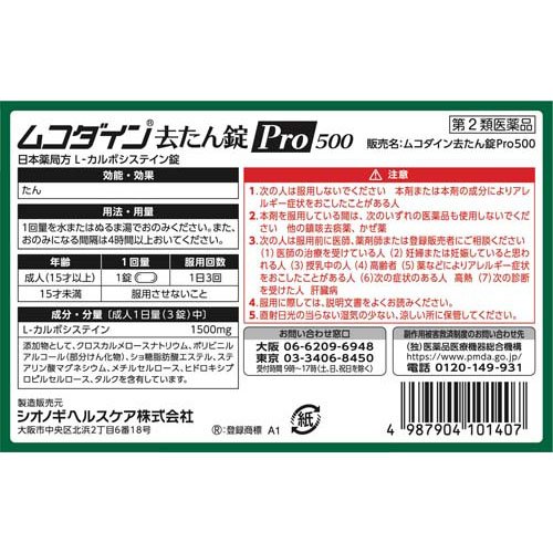 お店TOP>医薬品>風邪薬>咳止め・去たん>咳止め・去たん 錠剤>ムコダイン去たん錠Pro500 (20錠×2セット(セルフメディケーション税制対象))お一人様1セットまで。医薬品に関する注意文言【医薬品の使用期限】使用期限120日以上の商品を販売しております商品区分:第二類医薬品【ムコダイン去たん錠Pro500の商品詳細】●ムコダイン去たん錠Pro500はL-カルボシステインの作用により、たんの切れをよくする去たん薬です。【販売名】ムコダイン去たん錠Pro500【効能 効果】たん【用法 用量】次の量を水またはぬるま湯でおのみください。また、おのみになる間隔は4時間以上おいてください。(年齢:1回量:1日服用回数)成人(15才以上):1錠:3回15才未満:服用させないこと・定められた用法・用量を厳守してください。・錠剤の取り出し方錠剤の入っているPTPシートの凸部を指先で強く押して裏面のアルミ箔を破り、取り出しておのみください。(誤ってそのまま飲み込んだりすると、食道粘膜に突き刺さるなど思わぬ事故につながることがあります。)【成分】ムコダイン去たん錠Pro500は、白色のフィルムコーティング錠で、3錠(成人1日量)中に次の成分を含有しています。(成分:含量(3錠中)はたらき)L-カルボシステイン:1500mg:たんの切れをよくする添加物として クロスカルメロースナトリウム、ポリビニルアルコール(部分けん化物)、ショ糖脂肪酸エステル、ステアリン酸マグネシウム、メチルセルロース、ヒドロキシプロピルセルロース、タルクを含有しています。【注意事項】★してはいけないこと(守らないと現在の症状が悪化したり、副作用・事故がおこりやすくなります)1.次の人は服用しないでください本剤または本剤の成分によりアレルギー症状をおこしたことがある人2.本剤を服用している間は、次のいずれの医薬品も使用しないでください他の鎮咳去痰薬、かぜ薬★相談すること1.次の人は服用前に医師、薬剤師または登録販売者にご相談ください(1)医師の治療を受けている人(2)妊婦または妊娠していると思われる人(3)授乳中の人(4)高齢者(5)薬などによりアレルギー症状をおこしたことがある人(6)次の症状のある人高熱(7)次の診断を受けた人心臓病、肝臓病2.服用後、次の症状があらわれた場合は副作用の可能性があるので、直ちに服用を中止し、添付文書を持って医師、薬剤師または登録販売者にご相談ください(関係部位:症状)皮膚:発疹・発赤、かゆみ消化器:吐き気・嘔吐、食欲不振、下痢、腹痛、腹部膨満感、口のかわき呼吸器:息苦しさその他:発熱、むくみまれに下記の重篤な症状がおこることがあります。その場合は直ちに医師の診療を受けてください。(症状の名称:症状)ショック(アナフィラキシー):服用後すぐに、皮膚のかゆみ、じんましん、声のかすれ、くしゃみ、のどのかゆみ、息苦しさ、動悸、意識の混濁などがあらわれる。皮膚粘膜眼症候群(スティーブンス・ジョンソン症候群)、中毒性表皮壊死融解症:高熱、目の充血、目やに、唇のただれ、のどの痛み、皮膚の広範囲の発疹・発赤などが持続したり、急激に悪化する。肝機能障害:発熱、かゆみ、発疹、黄疸(皮膚や白目が黄色くなる)、褐色尿、全身のだるさ、食欲不振などがあらわれる3.5〜6回服用しても症状がよくならない場合は服用を中止し、添付文書を持って医師、薬剤師または登録販売者にご相談くださいまた、症状の改善がみられても2週間を超えて服用する場合は、医師、薬剤師または登録販売者にご相談ください★保管および取扱い上の注意(1)直射日光の当らない湿気の少ない、涼しい所に保管してください。(2)小児の手の届かない所に保管してください。(3)PTPシートから出して他の容器に入れ替えないでください。(誤用の原因になったり、品質が変化します)(4)使用期限をすぎた製品は、服用しないでください。【医薬品販売について】1.医薬品については、ギフトのご注文はお受けできません。2.医薬品の同一商品のご注文は、数量制限をさせていただいております。ご注文いただいた数量が、当社規定の制限を越えた場合には、薬剤師、登録販売者からご使用状況確認の連絡をさせていただきます。予めご了承ください。3.効能・効果、成分内容等をご確認いただくようお願いします。4.ご使用にあたっては、用法・用量を必ず、ご確認ください。5.医薬品のご使用については、商品の箱に記載または箱の中に添付されている「使用上の注意」を必ずお読みください。6.アレルギー体質の方、妊娠中の方等は、かかりつけの医師にご相談の上、ご購入ください。7.医薬品の使用等に関するお問い合わせは、当社薬剤師がお受けいたします。TEL:050-5577-5042email:kenkocom_4@shop.rakuten.co.jp【原産国】日本【発売元、製造元、輸入元又は販売元】シオノギヘルスケア※説明文は単品の内容です。リニューアルに伴い、パッケージ・内容等予告なく変更する場合がございます。予めご了承ください。・単品JAN:4987904101407広告文責:楽天グループ株式会社電話:050-5577-5042・・・・・