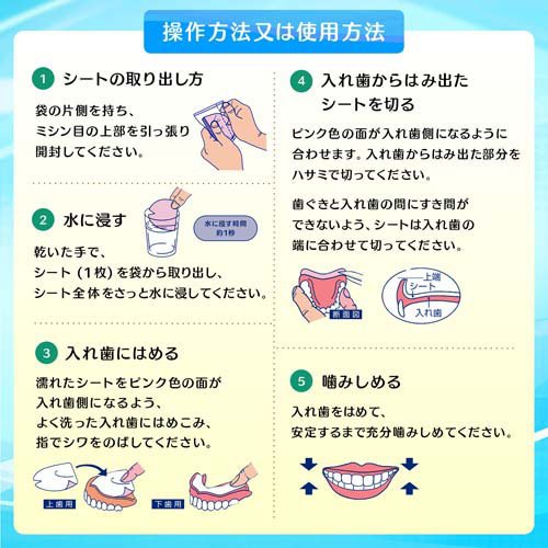 お店TOP>日用品>オーラルケア>入れ歯>入れ歯安定剤>シーボンドネオ下歯用 (30枚×3セット)商品区分:管理医療機器(認証番号:220ABBZI00290000)【シーボンドネオ下歯用の商品詳細】●シーボンドは、海草由来のアルギン酸ナトリウムと複数の粘着成分を含むシートタイプの総入れ歯用の安定剤です。●歯ぐきと入れ歯のすき間をピッタリとおおい、柔らかいクッション効果で歯ぐきへの負担も和らげます。不快な味やにおいもなく、入れ歯と歯ぐきの間からのはみ出しもありません。●また、スッキリはがせ、入れ歯のお手入れも簡単です。(販売名)シーボンド【使用方法】★使用方法(1)開封(シートの取り出し方) 袋の片側を持ち、ミシン目の上部を引っ張り開封してください。(2)浸す(水に浸す)乾いた手で、シート(1枚)を袋から取り出し、シート全体をさっと水に浸してください。(水に浸す時間:約1秒)(3)はめる(入れ歯にはめる) 濡れたシートをピンク色の面が入れ歯側になるよう、よく洗った入れ歯にはめこみ、指でシワをのばしてください。(4)切る(入れ歯から紙出たシートを切る)ピンク色の面が入れ歯側になるように合わせます。入れ歯からはみ出た部分をハサミで切ってください。歯ぐきと入れ歯の間にすき間ができないよう、シートは入れ歯の端に合わせて切ってください。(5)かむ(噛みしめる)入れ歯をはめて、安定するまで充分噛みしめてください。★使用可能な入れ歯の材質、種類・入れ歯の材質:プラスチック床:○、金属床:○・入れ歯の種類:総入れ歯:○・部分入れ歯:使えません・ブリッジ、さし歯:使えません★洗浄方法:入れ歯からシートを取り外し、入れ歯は歯ブラシなどでブラッシングし、最後に水洗いしてください。★使用方法に関する注意・定められた使用方法を守ってください。・1シートは1日分です。毎日新しいシートにお取り替えください。・使用中に本品がズレた場合、はがれて喉に詰まるおそれがあります。1)本品をつけた入れ歯は必ず就寝時にはずしてください。2)入れ歯が安定しない時は、水分が不足しているかもしれません。再度、シートを濡らし安定したのを確かめてからお使いください。・本品をつけたまま入れ歯を乾燥させないでください。固まってはがれ難くなることがあります。もし、固まってしまった場合は、入れ歯ごとぬるま湯に浸し、シートが柔らかくなったら、取り外してください。【成分】不織布(酢酸セルロース、再生セルロース、酸化チタン、アクリルポリマー)、アルギン酸ナトリウム、高重合ポリエ チレングリコール(90M)、カルメロースナトリウム、銅クロロフィリンナトリウム、赤色40号アルミニウムレーキ【規格概要】・形状:ピンク色(入れ歯側)白色(歯ぐき側)のシート・原理:総入れ歯と口腔粘膜とを粘着力で維持させる・品目仕様:粘着強さ 5kPa以上、pH値 4〜10【注意事項】★禁忌・禁止・次の人は使用しないでください。 1)食べ物等の飲み込みが困難な人(本品が喉に詰まるおそれがあります) 2)本品による過敏症状(発疹・発赤、かゆみ、はれ等)を起こしたことがある人 3)入れ歯に直接ふれるところに、荒れ、痛み、傷、はれ等の症状がある人・再使用禁止★使用上の注意・長期連用しないでください。連用する場合には、歯科医師にご相談ください。(歯ぐきがやせたり、噛み合わせが悪くなることがあります)・本品の使用中又は使用後に発疹・発赤、かゆみ、はれ等の症状があらわれた場合は、直ちに使用を中止し、この説明書をもって医師、歯科医師又は薬剤師に相談してください。・歯ぐきがやせる等により不適合になった入れ歯を本品で安定させるのは一時的な場合とし、できるだけ早く、歯科医師に入れ歯の調整を相談してください。・本品を使用しても入れ歯が安定しない場合は、使用を中止し歯科医師にご相談ください。★保管及び取扱い上の注意・小児の手の届かない所に保管してください。・袋から取り出す際は、必ず乾いた手でお取扱いください。・開封後は、高温・多湿な環境を避けて保管してください。・他の容器に入れ替えないでください。(誤用の原因になったり品質が変わります。)【原産国】アメリカ【ブランド】シーボンド【発売元、製造元、輸入元又は販売元】エーザイ※説明文は単品の内容です。リニューアルに伴い、パッケージ・内容等予告なく変更する場合がございます。予めご了承ください。・単品JAN:4987028129233エーザイ112-8088 東京都文京区小石川4-6-100120-161-454広告文責:楽天グループ株式会社電話:050-5577-5042[介護用衛生用品/ブランド:シーボンド/]