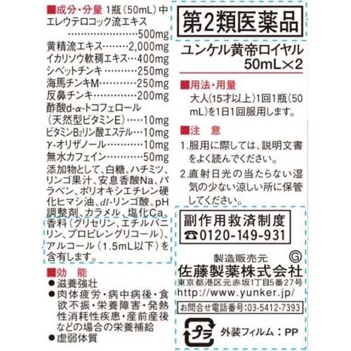 お店TOP>医薬品>ドリンク剤・滋養強壮剤>ドリンク剤>ドリンク剤 生薬製剤>ユンケル黄帝ロイヤル (2本入×2セット(1本50ml))お一人様1セットまで。医薬品に関する注意文言【医薬品の使用期限】使用期限120日以上の商品を販売しております商品区分:第二類医薬品【ユンケル黄帝ロイヤルの商品詳細】●滋養強壮効果の高い、エレウテロコック流エキス配合●黄精をユンケルDの2倍量配合し、イカリソウ、シベット、海馬、ハンピの他、ビタミンE、B2、γ-オリザノールを配合しました。●ハードワークが続く人の滋養強壮におすすめします。【効能 効果】・滋養強壮・肉体疲労・病中病後・食欲不振・栄養障害・発熱性消耗性疾患・産前産後などの場合の栄養補給・虚弱体質【用法 用量】(年齢:1回服用量/1日服用回数)大人(15才以上):1瓶(50mL)/1回15才未満:服用しないでください★用法・用量に関連する注意・定められた用法・用量を厳守してください。【成分】(1瓶(50mL)中)エレウテロコック流エキス:500mg黄精流エキス:2000mgイカリソウ軟稠エキス:400mgシベットチンキ:250mg海馬チンキM:250mg反鼻チンキ:200mg酢酸d-α-トコフェロール(天然型ビタミンE):10mgビタミンB2リン酸エステル:10mgγ-オリザノール:10mg無水カフェイン:50mg添加物として、白糖、ハチミツ、リンゴ果汁、安息香酸Na、パラベン、ポリオキシエチレン硬化ヒマシ油、dL-リンゴ酸、pH調整剤、カラメル、塩化Ca、香料(グリセリン、エチルバニリン、プロピレングリコールを含む)、アルコール(1.5mL以下)を含有します。★成分・分量に関連する注意・本剤はビタミンB2リン酸エステルを含有するため、本剤の服用により、尿が黄色くなることがあります。・本剤は生薬エキスを配合していますので、わずかに濁りを生じることがありますが、効果には変わりありません。【注意事項】★使用上の注意(相談すること)・次の場合は直ちに服用を中止し、この文書を持って医師又は薬剤師にご相談ください。(1)服用後、次の症状があらわれた場合関係部位:皮ふ症状:発疹・発赤、かゆみ(2)しばらく服用しても症状がよくならない場合★保管及び取扱い上の注意・直射日光の当らない湿気の少ない涼しい所に保管してください。・小児の手の届かない所に保管してください。・他の容器に入れ替えないでください。(誤用の原因になったり品質が変わる恐れがあります)・使用期限をすぎた製品は、服用しないでください。【医薬品販売について】1.医薬品については、ギフトのご注文はお受けできません。2.医薬品の同一商品のご注文は、数量制限をさせていただいております。ご注文いただいた数量が、当社規定の制限を越えた場合には、薬剤師、登録販売者からご使用状況確認の連絡をさせていただきます。予めご了承ください。3.効能・効果、成分内容等をご確認いただくようお願いします。4.ご使用にあたっては、用法・用量を必ず、ご確認ください。5.医薬品のご使用については、商品の箱に記載または箱の中に添付されている「使用上の注意」を必ずお読みください。6.アレルギー体質の方、妊娠中の方等は、かかりつけの医師にご相談の上、ご購入ください。7.医薬品の使用等に関するお問い合わせは、当社薬剤師がお受けいたします。TEL:050-5577-5042email:kenkocom_4@shop.rakuten.co.jp【原産国】日本【ブランド】ユンケル【発売元、製造元、輸入元又は販売元】佐藤製薬※説明文は単品の内容です。リニューアルに伴い、パッケージ・内容等予告なく変更する場合がございます。予めご了承ください。・単品JAN:4987316030388広告文責:楽天グループ株式会社電話:050-5577-5042・・・・・・・・・・・・・・[滋養強壮・肉体疲労/ブランド:ユンケル/]