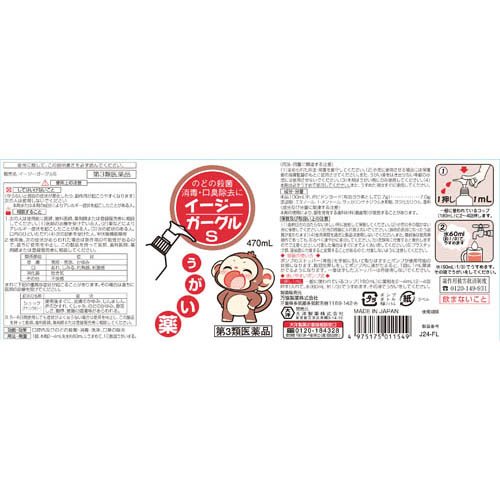 お店TOP>医薬品>口中薬>のどあれ・のどの痛み>うがい薬(医薬品)>タイヨー イージーガーグルS (470ml)お一人様5個まで。医薬品に関する注意文言【医薬品の使用期限】使用期限120日以上の商品を販売しております商品区分:第三類医薬品【タイヨー イージーガーグルSの商品詳細】●のどの殺菌消毒・口臭除去に。●ポビドンヨードが、細菌、真菌、ウイルスなど●幅広い殺菌、消毒効果を発揮します。●ポンプ式だから、毎回とても使い易い!【販売名】イージーガーグルS【効能 効果】口腔内及びのどの殺菌・消毒・洗浄、口臭の除去【用法 用量】1回、本剤2〜4mLを水約60mLにうすめて、1日数回うがいする。★用法・用量に関連する注意(1)定められた用法・用量を厳守してください。(2)小児に使用させる場合には保護者の指導監督のもとに使用させてください。また、うがい液をはき出せない年齢の小児には使用させないでください。(3)本剤はうがい用にのみ使用してください。(4)本剤は必ずうすめて使用してください。また、うすめた液はすぐに使用してください。【使用方法】★容器の使い方ポンプのストッパー(青色)を手前に引いて取りはずすとポンプが使用可能の状態になります。数回空押しをしてポンプ内に液がたまると、1回に1mL薬液がでるようになります。一度はずしたストッパーは再使用しないでください。★1押し1mL一般に使われているコップ(180mL)に薬剤を2〜4mL(2〜4回押す)入れて、水(60mL:約1/3)でうすめます。その液でうがいをしてください。【成分】本品100mL中、ポビドンヨード(有効ヨウ素として0.7g):7.0g添加物:エタノール、L-メントール、サッカリンナトリウム水和物、ヨウ化カリウム、香料★成分及び分量に関連する注意本剤の使用により、銀を含有する歯科材料(義歯等)が変色することがあります。【注意事項】★使用上の注意・してはいけないこと(守らないと現在の症状が悪化したり、副作用が起こりやすくなります)次の人は使用しないでください。本剤または本剤の成分によりアレルギー症状を起こしたことがある人。・相談すること1.次の人は使用前に医師、歯科医師、薬剤師または登録販売者に相談してください。(1)医師の治療を受けている人。(2)薬などによりアレルギー症状を起こしたことがある人。(3)次の症状のある人。口内のひどいただれ (4)次の診断を受けた人。甲状腺機能障害2.使用後、次の症状があらわれた場合は副作用の可能性があるので、直ちに使用を中止し、この製品を持って医師、歯科医師、薬剤師また登録販売者に相談してください。[関係部位:症状]皮膚:発疹・発赤、かゆみ口:あれ、しみる、灼熱感、刺激感消化器:吐き気その他:不快感まれに下記の重篤な症状が起こることがあります。 その場合は直ちに医師の診療を受けてください。[症状の名称:症状]ショック(アナフィラキシー):使用後すぐに、皮膚のかゆみ、じんましん、声のかすれ、くしゃみ、のどのかゆみ、息苦しさ、動悸、意識の混濁等があらわれる。3.5〜6日間使用しても症状がよくならない場合は使用を中止し、この製品を持って医師、歯科医師、薬剤師または登録販売者に相談してください。★保管及び取扱い上の注意(1)直射日光の当たらない涼しい所に密栓して保管してください。(2)小児の手の届かない所に保管してください。(3)他の容器に入れ替えないでください。(誤用の原因になったり品質が変わります)(4)使用期限を過ぎた製品は使用しないでください。また、開封後は使用期限内であっても、なるべく速やかに使用してください。(5)衣類等に付着すると着色しますのでご注意ください。付着した場合はすぐに水でよく洗い流してください。(6)プラスチック類、塗装面に付着すると変質することがあるので、付着しないように注意してください。【医薬品販売について】1.医薬品については、ギフトのご注文はお受けできません。2.医薬品の同一商品のご注文は、数量制限をさせていただいております。ご注文いただいた数量が、当社規定の制限を越えた場合には、薬剤師、登録販売者からご使用状況確認の連絡をさせていただきます。予めご了承ください。3.効能・効果、成分内容等をご確認いただくようお願いします。4.ご使用にあたっては、用法・用量を必ず、ご確認ください。5.医薬品のご使用については、商品の箱に記載または箱の中に添付されている「使用上の注意」を必ずお読みください。6.アレルギー体質の方、妊娠中の方等は、かかりつけの医師にご相談の上、ご購入ください。7.医薬品の使用等に関するお問い合わせは、当社薬剤師がお受けいたします。TEL:050-5577-5042email:kenkocom_4@shop.rakuten.co.jp【原産国】日本【発売元、製造元、輸入元又は販売元】大洋製薬リニューアルに伴い、パッケージ・内容等予告なく変更する場合がございます。予めご了承ください。広告文責:楽天グループ株式会社電話:050-5577-5042・・・・・・・・・・・・・・[うがい薬・のどの薬]