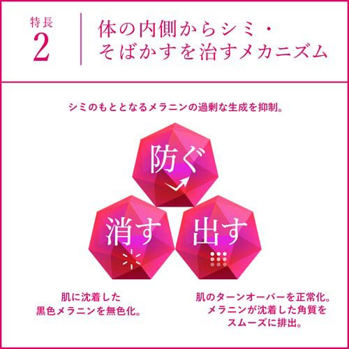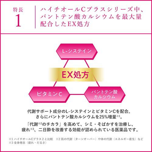 お店TOP>医薬品>皮膚の薬>しみ・そばかす(シミ・ソバカス)>しみ・そばかすの薬 錠剤>ハイチオール CプラスEX (360錠)お一人様5個まで。医薬品に関する注意文言【医薬品の使用期限】使用期限120日以上の商品を販売しております商品区分:第三類医薬品【ハイチオール CプラスEXの商品詳細】●体の内側からシミ・そばかすを治します。L-システインが肌細胞の生まれ変わりを正常化し、ビタミンCとの相乗効果で、シミ・そばかすの原因でもあるできてしまった過剰なメラニンを排出します。●シミ・そばかすには1日2回の継続服用が効果的です。肌は約42日間で生まれ変わります。新しい肌が表面の肌に成長するまで時間がかかりますので、継続服用が効果的※です。ハイチオールCプラスEXが、シミ・そばかすを治していきます。※効果には個人差があります。しばらく服用しても症状がよくならない場合は、医師、薬剤師等に相談してください。●全身倦怠(疲れ・だるさ)、二日酔にも効果を発揮します。L-システインが肝臓で働き、体の代謝(エネルギー産生)を助け、疲れ・だるさを改善します。また、アルコールが代謝されてできるアセトアルデヒドと直接反応して無毒化したり、アルコールを無害な物質に変える酵素の働きを助け、二日酔にも効果を発揮します。【販売名】ハイチオールCプラスEX【効能 効果】・しみ・そばかす・日やけ等の色素沈着症・全身倦怠・二日酔・にきび、湿疹、じんましん、かぶれ、くすりまけ【用法 用量】次の1回量を1日2回、水又はぬるま湯で服用してください。[年齢:1回量]成人(15才以上):2錠7才〜14才:1錠7才未満:服用しないこと★用法・用量に関連する注意(1)用法・用量を厳守してください。(2)食前・食後にかかわらず、いつでも服用できます。(3)小児に服用させる場合には、保護者の指導監督のもとに服用させてください。【成分】4錠(成人1日量)中L-システイン:240mgアスコルビン酸(ビタミンC):500mgパントテン酸カルシウム:30mg添加物:無水ケイ酸、セルロース、乳酸Ca、ヒプロメロース、ヒドロキシプロピルセルロース、マクロゴール、ステアリン酸Ca、タルク、酸化チタン、トウモロコシデンプン、酒石酸、ジメチルポリシロキサン、二酸化ケイ素、ポリビニルアルコール・アクリル酸・メタクリル酸メチル共重合体【注意事項】★使用上の注意・相談すること1.服用後、次の症状があらわれた場合は副作用の可能性があるので、直ちに服用を中止し、この説明書を持って医師、薬剤師又は登録販売者に相談してください[関係部位:症状]皮膚:発疹消化器:吐き気・嘔吐、腹痛2.服用後、次の症状があらわれることがあるので、このような症状の持続又は増強が見られた場合には、服用を中止し、この説明書を持って医師、薬剤師又は登録販売者に相談してください下痢3.しばらく服用しても症状がよくならない場合は服用を中止し、この説明書を持って医師、薬剤師又は登録販売者に相談してください★その他の注意・本剤の服用により、尿及び大便の検査値が影響を受けることがあります。医師の検査を受ける場合は、ビタミンCを服用していることを医師にお知らせください。★保管及び取り扱い上の注意(1)直射日光の当たらない湿気の少ない涼しい所に保管してください。(2)小児の手の届かない所に保管してください。(3)他の容器に入れ替えないでください。(誤用の原因になったり品質が変わることがあります。)(4)ビンのフタはよくしめてください。しめ方が不十分ですと湿気などのため変質することがあります。また、本剤をぬれた手で扱わないでください。(5)ビンの中のつめ物は、輸送中に錠剤が破損するのを防ぐためのものです。開封後は不要となりますので取り除いてください。(6)使用期限をすぎたものは服用しないでください。【医薬品販売について】1.医薬品については、ギフトのご注文はお受けできません。2.医薬品の同一商品のご注文は、数量制限をさせていただいております。ご注文いただいた数量が、当社規定の制限を越えた場合には、薬剤師、登録販売者からご使用状況確認の連絡をさせていただきます。予めご了承ください。3.効能・効果、成分内容等をご確認いただくようお願いします。4.ご使用にあたっては、用法・用量を必ず、ご確認ください。5.医薬品のご使用については、商品の箱に記載または箱の中に添付されている「使用上の注意」を必ずお読みください。6.アレルギー体質の方、妊娠中の方等は、かかりつけの医師にご相談の上、ご購入ください。7.医薬品の使用等に関するお問い合わせは、当社薬剤師がお受けいたします。TEL:050-5577-5042email:kenkocom_4@shop.rakuten.co.jp【原産国】日本【発売元、製造元、輸入元又は販売元】エスエス製薬リニューアルに伴い、パッケージ・内容等予告なく変更する場合がございます。予めご了承ください。広告文責:楽天グループ株式会社電話:050-5577-5042・・・・・・・・・・・・・・[皮膚・肌荒れ・にきびの薬]
