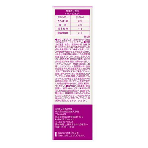 お店TOP>健康食品>食事療法>カロリーコントロール食品>低カロリーゼリー>FOODOLOGY コレオロジー快調ゼリー (10本入×2セット(1本25g))【FOODOLOGY コレオロジー快調ゼリーの商品詳細】●毎朝スッキリを目指す方におすすめ●バッグに入るコンパクトサイズ●チアシード配合で満腹感を【召し上がり方】1日あたり1本(25g)を目安にお召し上がりください。【品名・名称】ゼリー【FOODOLOGY コレオロジー快調ゼリーの原材料】食物繊維(ポリデキストロース)、赤ブドウ濃縮液、ガルシニアカンボジアエキス、フラクトオリゴ糖、チアシード、ラクチュロース、イソマルトオリゴ糖、野菜混合濃縮粉末、フィッシュコラーゲン、エラスチンペプチド混合エキス粉末、米ぬかエキス粉末、プルーン濃縮液、ミックスベリー濃縮液、チコリー根繊維、乳酸菌ビフィズス菌混合粉末/粘料(増粘多糖類)、クエン酸、香料、甘味料(キシリトール、ソルビトール、スクラロース)、着色料(野菜色素、クチナシ)、環状オリゴ糖、クエン酸Na、ヒアルロン酸、酸化防止剤(V.C)、(一部に乳成分・小麦を含む)【栄養成分】1本(25g)あたりエネルギー:35.5kcal、たんぱく質:0.2g、脂質:0.2g、炭水化物:11g、食塩相当量:0.1g推定値【アレルギー物質】乳成分・小麦【規格概要】250g(25g×10本)【保存方法】直射日光・高温多湿な場所を避けて保存してください。【注意事項】・食生活は、主食、主菜、副菜を基本に食事のバランスを。★摂取上の注意・本品は、疾病の診断、治療、予防を目的としたものではありません。・本品は多量摂取により疾病が治癒したり、より健康が増進するものではありません。・本品は過剰摂取を避け、1日の摂取目安を超えないようにお召し上がりください。・摂取の際、胃部の不快感、消化不良の症状がある場合は摂取を中止してください。・アレルギー物質を確認の上、お召し上がりください。・製品開封時、包装材に傷が付き、中身が漏れることがありますので取り扱いにはご注意ください。・妊娠・授乳中の方、お子様は摂取しないでください。・肝臓・腎臓・心臓疾患、アレルギーおよび喘息など薬を服用中の方は医師に相談してください。・異常が発生した場合は摂取を中止し、医師に相談してください。★取り扱い上の注意・賞味期限は表示された方法で未開封で保存した場合に品質が保たれる期限です。・開封後は賞味期限に関わらずお早めにお召し上がりください。・乳幼児の手の届かないところに保存してください。・1歳未満の乳児には与えないでください。【原産国】韓国【発売元、製造元、輸入元又は販売元】韓国高麗人參社※説明文は単品の内容です。リニューアルに伴い、パッケージ・内容等予告なく変更する場合がございます。予めご了承ください。・単品JAN:4570128221435韓国高麗人參社東京都中野区本町2-46‐1中野坂上サンブライトツイン2302号03-6279-3606広告文責:楽天グループ株式会社電話:050-5577-5042[ダイエット食品]