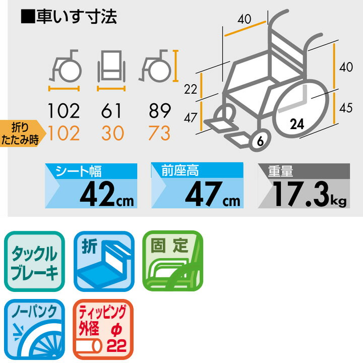 お届け先が法人様 限定 商品ページお届け先が「法人様・施設様・病院様」の場合にご注文いただける商品ページとなります。ご注文者様が個人様の場合でも、お届け先が法人様・施設様・病院様宛であればご注文いただけます。※お届け先が個人様宛の場合、送料2,700円を加算させていただきますのでご了承ください。※北海道・沖縄・離島は法人様宛の場合でも別途送料が追加になります。個人様のご自宅宛商品ページはこちらいつでもお買い得!!送料無料の車椅子クッションシートも付いて23,800円お尻も背中も痛くならない24,300円お尻も背中も痛くならない23,300円多機能タイプがお手頃価格”29,980円”で新登場>>>大きめの痛くならない〜すはこちら24,300円>>>新発売 お出かけに最適!!持ち運びに便利なコンパクト車椅子16,900円 ノーパンク(ハイポリマー)タイヤ装備のリーズナブルなスチール製車いすです。○メンテナンスフリーの黒色ノーパンクタイヤ○背折れ○折りたたみ可○ビニールレザー紺○フレーム材質:スチール仕様表サイズ幅61×長102×高89cm重量17.3kg座幅42cm前座高47cm耐荷重100kg背シート高40cm車輪径後輪24インチ×キャスタ6インチ肘掛け高22cm詳細シート奥行:40cm折りたたみサイズ:幅30×長102×高73cm規格1台