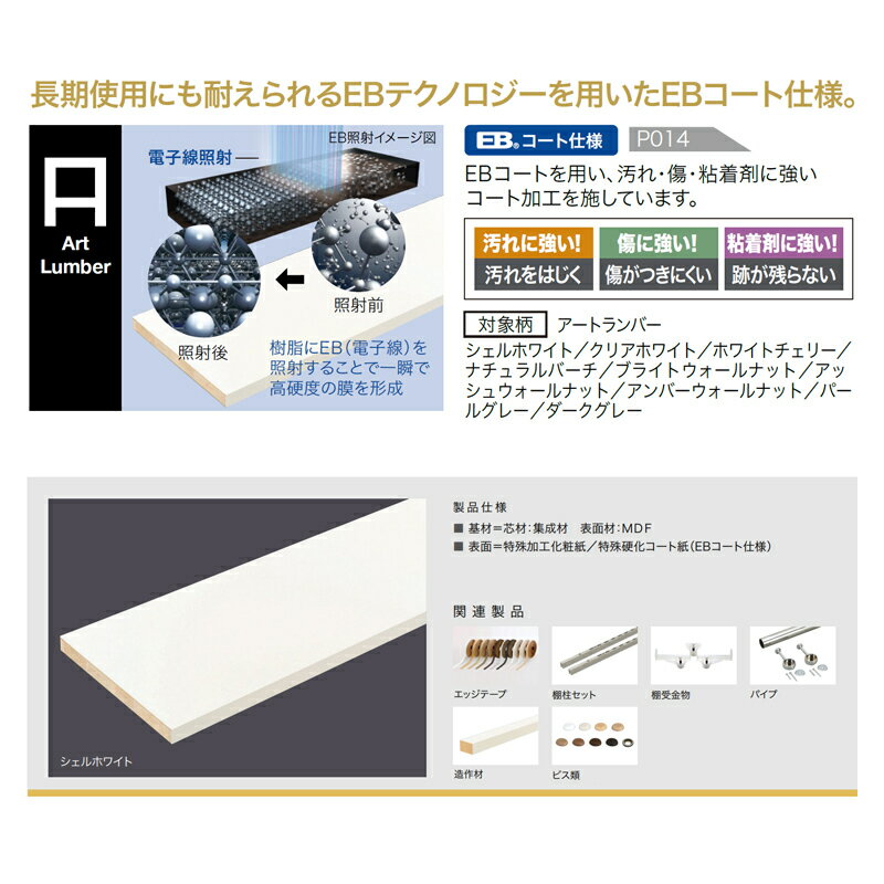 メーカー希望小売価格はメーカーカタログに基づいて掲載しています ※カタログのメーカー小売希望価格は、税抜き価格となっております。この商品は 南海プライウッド【樹脂棚板アートランバー 1面エッジテープ貼り 1810×300×20mm 1枚入】NANKAI PLYWOOD 個人宅配送OK! ポイント 多彩なカラーと豊富なサイズラインナップで、設置場所や使用用途、収納ニーズに対応できます。 ショップからのメッセージ 納期について ご注文後、7営業日以内に出荷いたします。 4