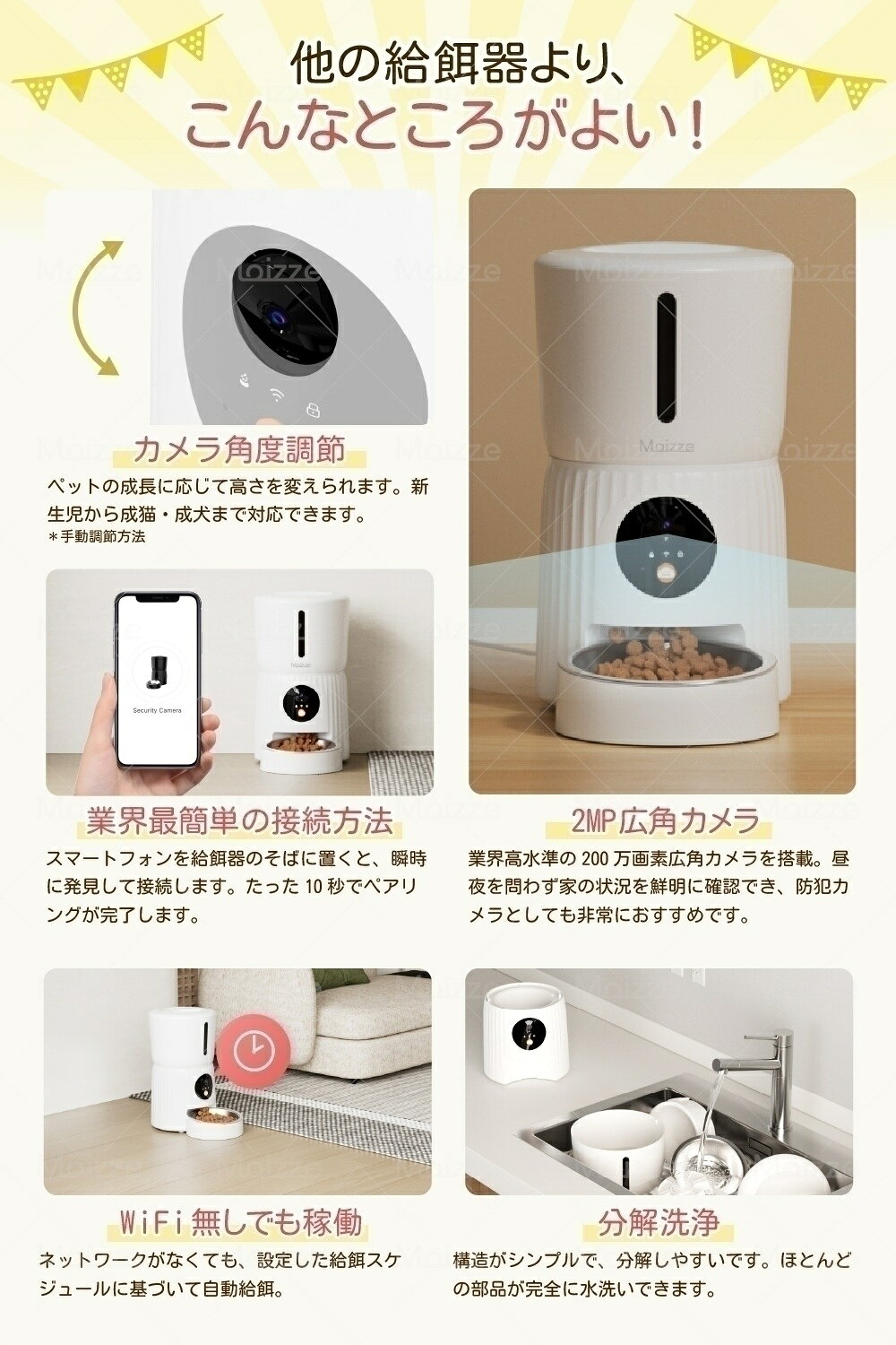 Moizze 自動給餌器 カメラ付き 多機能 猫 犬 自動餌やり機 ペットカメラ ペット給餌機 4L WiFi アプリ遠隔操作 録音 再生 早食い防止 簡単お手入れ 給餌記録 2WAY電源 PET001K/T