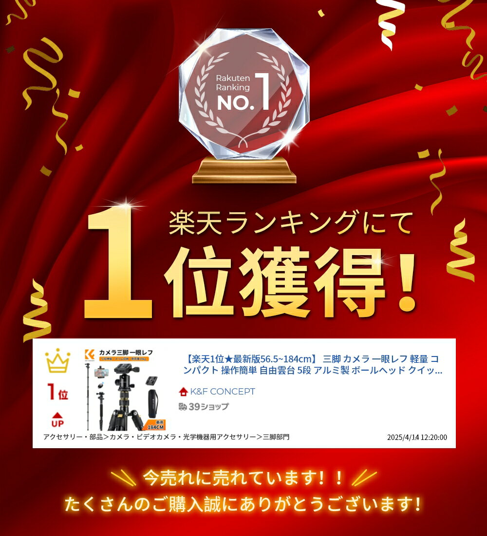 商品詳細 仕様 品番:KF09.007V1 モデル:TM2324 色: ブラック、ゴールド 折りたたみ可能: √ 一脚として分離可能: √ 中軸横置き可能: X 雲台: N-1 雲台重量 (g): 248 耐荷重 (kg): 10 クイックリリースプレート素材: プラスチック ロック方式: レバー式ロック ロック部材質:プラスチック ポールの材質: アルミ合金 脚の段数: 5 センターポール段数: 2 最小管径 (mm): 14 最大管径 (mm): 27 最高高さ (mm): 1840 センターポール未使用時の高さ (mm): 1395 最低高さ (mm): 565 収納時高さ (mm): 435 三脚と雲台の自重 (g): 1625 製品重量 (パッケージ込み) (g): 2060 バッケージ内容 三脚本体 スクリュー・アダプター・リングヘッド スマホホルダー 六角レンチ ブルートゥース・リモコン クイックリリースプレート*2 収納バーグ 説明書 おすすめポイント この度は新開発されたカメラ用三脚架のご紹介をさせていただきます。実用性と携帯性を兼ね備えたこの三脚架は、以下の特長を持っております。 1、最大高さは184cm(72インチ)に達し、反折デザインにより収納時の長さは43cmに抑えられています。 2、28mmの球体を採用したヘッドは、安全に10Kgの重量を支えることができ、アルカスイス規格のクイックリリースプレートに対応しています。 3、ヘッドの底部には360度の水平目盛があり、パノラマ写真の撮影がより簡単になります。 4、脚管には板扣デザインを採用し、脚のロックと解除が簡単にでき、脚架の開閉時間を節約できます(ネジ式よりも便利です)。 5、三脚は独脚架としても使用可能で、中央の軸を加えることで最高195cm(76.8インチ)まで高くすることができます。 6、スマートフォンホルダーとBluetoothリモコンが付属しており、三脚に直接取り付けての自撮りや10メートル以内の遠隔撮影が可能です。 7、さらに、追加のクイックリリースプレートが付属しており、いつでも交換が可能です。 この三脚は、プロの写真家から趣味の写真撮影を楽しむ方まで、幅広いニーズにお応えすることができる製品です。 撮影の可能性を広げ、あらゆるシーンでの撮影をサポートします。ぜひこの機会にご検討ください。 注意事項 1.推奨最大荷重以内ご利用いただきます。 2.製品を使用する時に、必ず底部スタンドと各部のネジをロックしてくだい。安定な状態で操作してください。 3.湿気、砂、ほこりの多い環境で使用したり、製品を清掃したりしないでください。海水に浸すことはお勧めしません。 4.製品を高温環境や直射日光に置かないでください。 5.この商品は写真撮影のみで、他の用途にはご利用いただけません。 そのほか ※カメラなどは付属しておりませんので予めご了承くださいませ。 ※採寸方法により多少の誤差が生じる場合がございます、ご了承ください。 ※ご利用のパソコンなどの解像度の影響で、色差がある可能性があり、予めご了承くださいませ。 検索関連キーワード(商品の説明ではありません) K&F Concept 三脚 一眼レフ 軽量 コンパクト 自由雲台 5段 アルミ製 ボールヘッド クイックシュー式 レバーロック 三脚ケース付き デジタルカメラ 一眼レフ 折り畳み可能 メーカー直営店三脚 コンパクト ビデオカメラ スマホ カメラ スマホ三脚 一眼レフ 自撮り カメラ三脚 三脚スタンド 雲台 ミニ三脚 収納袋付き iphone アルミ 撮影 iPhone 折り畳み 360回転 多機能 スタンド 小型 デジカメ 伸縮式 送料無料 運動会 Android 一眼レフ用 360度回転 さんきゃく 発表会 初心者 雲台付き スマホ用三脚 一脚 タブレット俯瞰撮影 ビデオカメラ三脚 ブラック 携帯 スマホホルダー付き メーカー希望小売価格はメーカーサイトに基づいて掲載しています メーカー希望小売価格はメーカーサイトに基づいて掲載しています メーカー希望小売価格はメーカーサイトに基づいて掲載していますよくあるご質問 Q: 三脚架の折りたたみ収納は便利ですか? A: 当社の三脚架は反折りたたみ設計を採用しており、収納が非常に便利です。折りたたんだ後のサイズはわずか43mmで、写真家が旅行や屋外撮影時に持ち運びやすいです。 Q: 板扣(板バックル)設計の利点は何ですか? A: 板扣設計は、ユーザーが脚管を素早くロックおよび解放できるようにし、同時に構造の安定性を保証します。迅速な撮影や撮影高さの調整に非常に適しています。 Q: 三脚に他の雲台を取り付けることはできますか? A: はい、三脚の雲台ベースには3/8インチのインターフェースがあり、他の雲台と互換性があります。 Q: 三脚の最大耐荷重はどのくらいですか? A: 当社の三脚は厳格なテストを受けており、最大10キログラムまで耐えることができます。 Q: 三脚にはどのような素材を使用していますか? A: こちらの三脚は高品質のアルミ合金素材を使用しており、軽量でありながら頑丈な特徴を持ち、撮影中の安定性を保証します。 Q: 三脚は異なる地形に適していますか? A: はい、三脚の脚管は必要に応じて長さと角度を調整でき、不平坦な地面や階段など、さまざまな地形に対応できます。 Q: 三脚には滑り止め設計がありますか? A: は