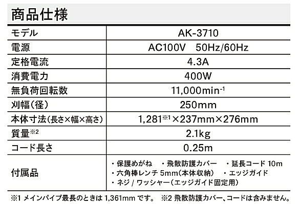 ●KYOCERA Industrial Tools Corporation/京セラインダストリアルツールズ販売 ●単相100V 刈幅(径)250mm ナイロンカッター専用 ●家周りの草刈りから芝刈まで、音の静かな電気式 ●ワンタッチで長さ調整ができる伸縮機能付(伸縮幅8cm) ●キワ刈りに便利なエッジガイド付 ●刈った草がかかりにくい右回転 ●縁刈りに便利な180度回転ヘッド [仕様] ・電源:単相/交流 100V 50/60Hz ・定格電流:4.3A ・消費電力:400W ・無負荷回転数:11,000min-1 ・刈幅(径):250mm ・サイズ:長さ1,281×幅237×高さ276mm ・質量:2.1kg ・絶縁方式:二重絶縁 ・コード長さ:0.25m [付属品] ・ナイロンカッター(φ1.65×7m) ・保護めがね ・飛散防護カバー ・延長コード(10m) ・エッジガイド(ネジワッシャー付) ・六角棒レンチ 5mm(本体収納)