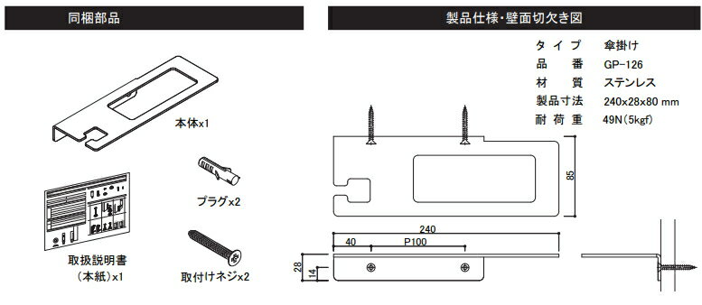 ●戸建て・集合住宅兼用 傘掛け/フック ●傘や買い物袋などで手がふさがって玄関の鍵が開けずらくなる時に、一時的に掛けて置ける万能フック。 ●センターには傘掛け、左側は買い物袋などが掛けられます。 ●セット内容:本体×1、各種取り付けパーツ、取扱説明書 ●サイズ(外寸):H28×W240×D85mm ●仕上げ:サンドブラストブラック ●材質:ステンレス ●耐荷重:49N(5kgf)