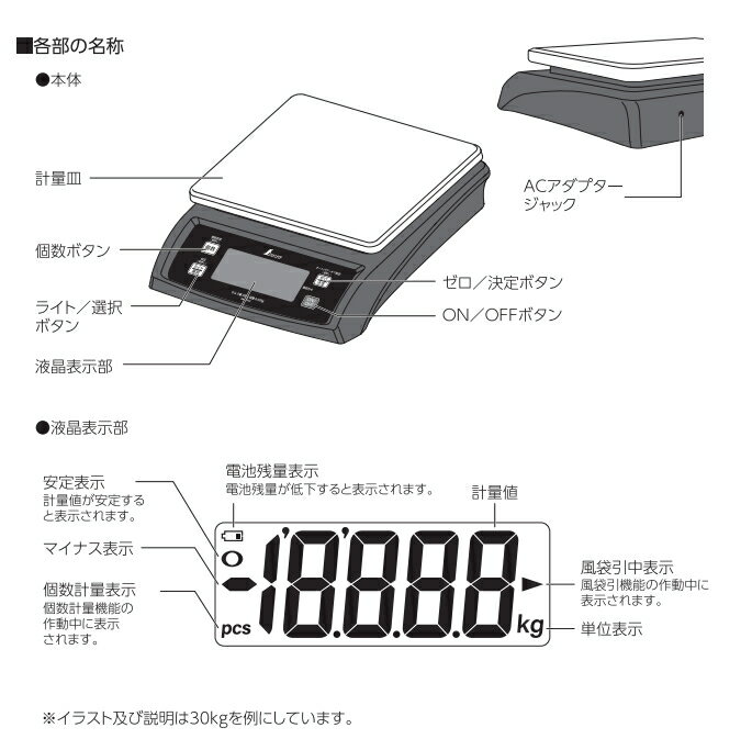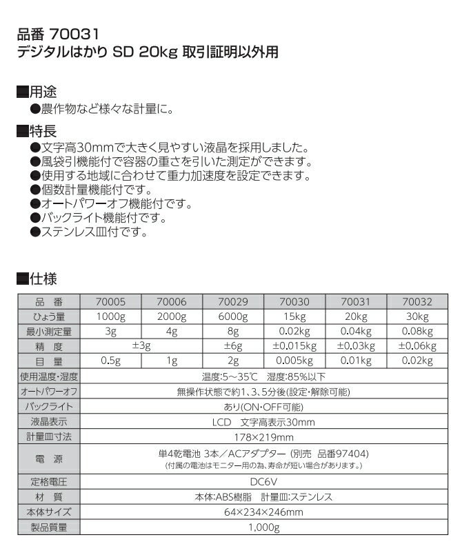 ●シンワ測定株式会社/sinwa ●用途:農作物など様々な計量測定に ●文字高30mmで大きく見やすい液晶を採用しました。 ●風袋引機能付で容器の重さを引いた測定ができます。 ●使用する地域に合わせて重力加速度を設定できます。 ●オートパワーオフ機能付です。 ●バックライト機能付です。 ●ステンレス皿付です。 [仕様] ・ひょう量: 20kg ・最小測定量: 0.04kg ・精度: ±0.03kg ・目量: 0.01kg ・使用温度・湿度 温度:5~35℃ 湿度:85%以下 ・オートパワーオフ: 無操作状態で約1、3、5、10分後(設定・解除可能) ・バックライト: あり(ON・OFF可能) ・液晶表示: LCD 文字高表示30mm ・計量皿寸法: 175×215mm ・電源: 単4アルカリ乾電池 3本/ACアダプター(別売 品番97404) (※付属の電池はモニター用の為、寿命が短い場合があります。) ・定格電圧: DC6V ・材質 本体:ABS樹脂 計量皿:ステンレス ・本体サイズ: 246×234×64mm ・製品重量: 1,000g 画面左上のショップ内検索をご利用ください。