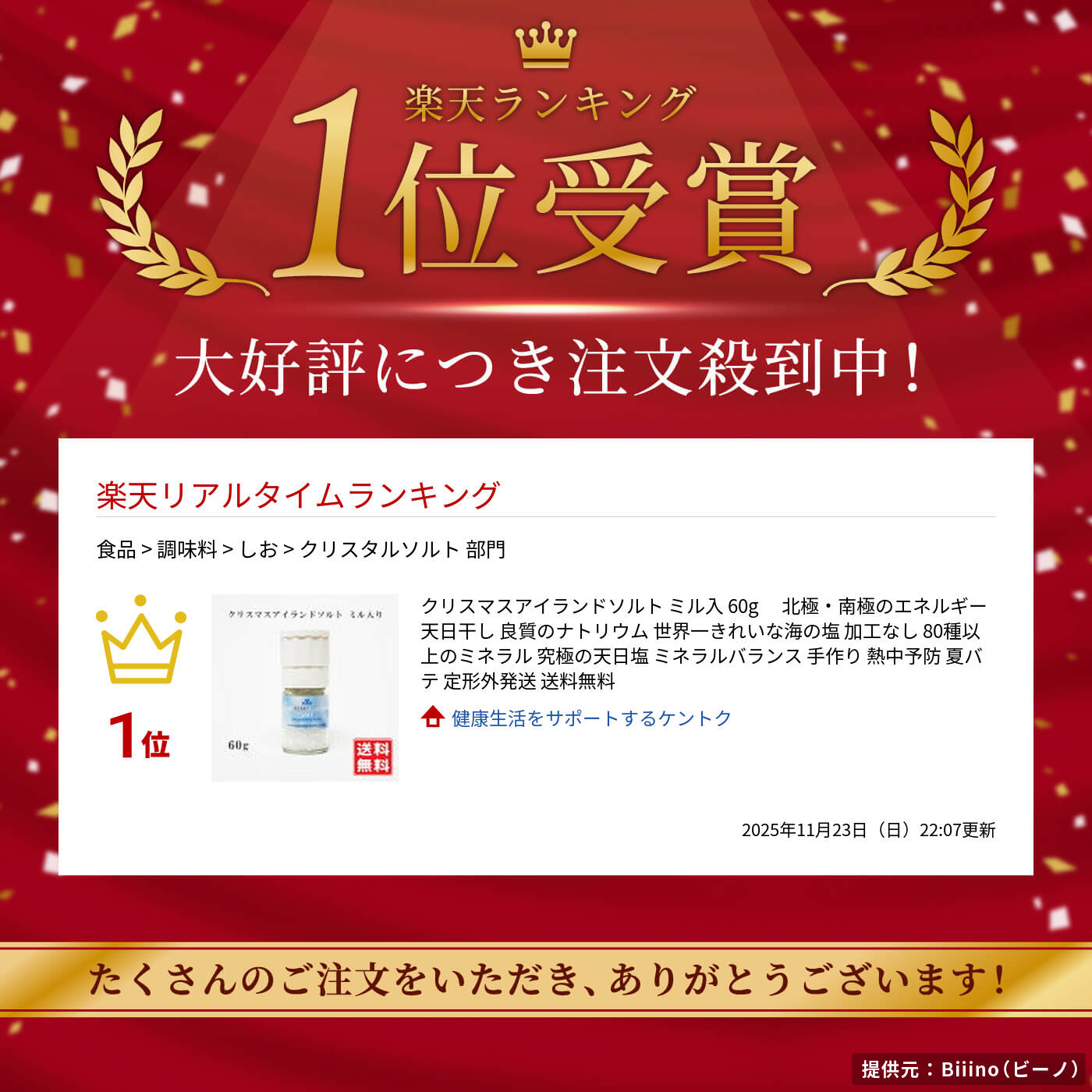 クリスマスアイランドソルト ミル入 60g 北極・南極のエネルギー 天日干し 良質のナトリウム 世界一きれいな海の塩 加工なし 80種以上のミネラル 究極の天日塩 ミネラルバランス 手作り 熱中予防 夏バテ 定形外発送 送料無料