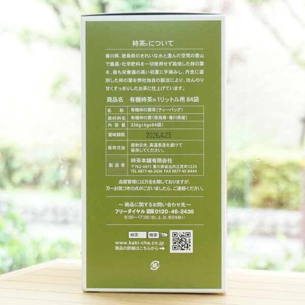 ■香川県で70年以上も前から作られている伝統のある柿茶 ■香川県、徳島県のきれいな水と澄んだ空気の里山で農薬・化学肥料を一切使用せず栽培した柿の葉を、最も栄養価の高い初夏に手摘み ■丹念に選別した柿の葉を、独自の製法により、ほんのり甘くすっきり ■ノンカフェイン 【原料名】有機柿の葉(徳島県・香川県産) 【内容量】336g(4g×84袋)