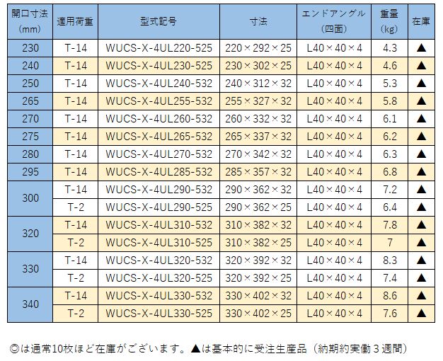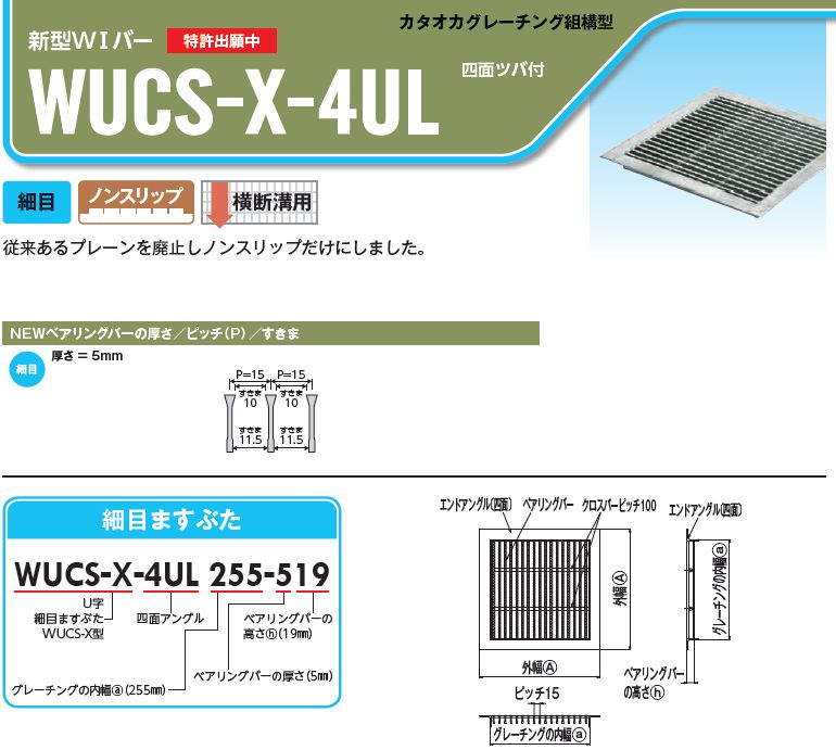 グレーチング四面ツバ付き桝蓋用 細目ノンスリップ 270mm用 適応荷重T-14 重量 6.1kg 形式記号 WUCS-X-4UL260-532