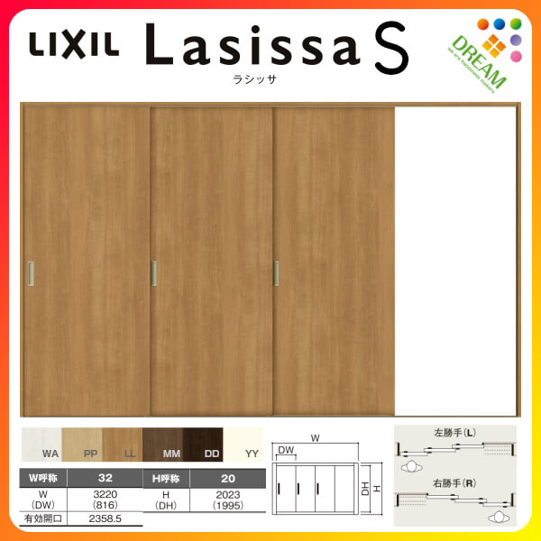 室内引き戸 Vレール方式 3枚建 片引き戸 ラシッサS LAA ノンケーシング枠 3220 W3220×H2023mm リクシル LIXIL トステム TOSTEM 室内ドア 室内引戸 引き戸 片引戸 建材 室内 建具 交換 リフォーム DIY kenzai