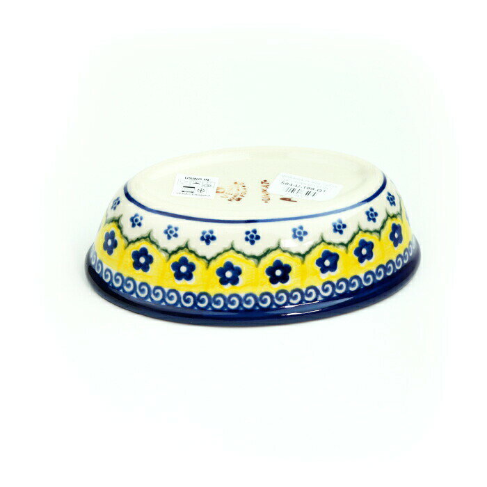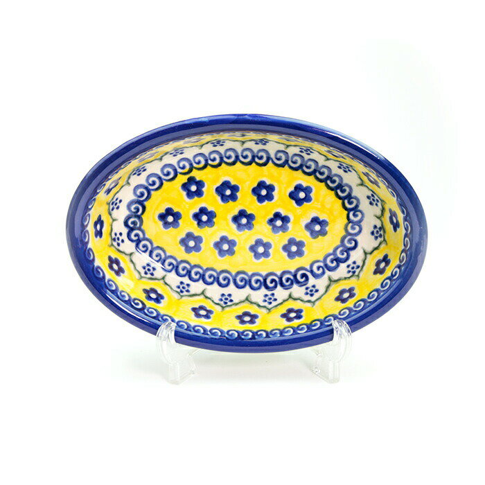 耐熱皿としてだけでない多様な用途でご利用いただける可愛い器 一人前の小さなオーブン皿として誕生しました。コクのあるクリーム系のグラタンや小さなドリアにぴったりです。小さな耐熱容器にも外側だけでなく内側にも丁寧に細かく絵付けされているポーリッシュポタリー独特の美しく愛らしい仕上がり。サイドディッシュを盛り付けたり、フルーツボウルとして等、幅広くお使いいただけます。 くっきりと濃い黄色の目立ちたがり屋 濃い黄色とくっきりとした紺色のスタンプで構成された意匠は、ポーリッシュポタリーの多数派である藍色ベースの配色とはちょっと違った雰囲気です。緑色で縁取りされた白い部分がレースのように見え、この柄のお洒落なアクセントになっています。 商品詳細 大きさ 約16×11cm 高さ 約4.5cm 容量(満水時) 約0.27L Ceramika Artystyczna VENA(ヴェナ)社製