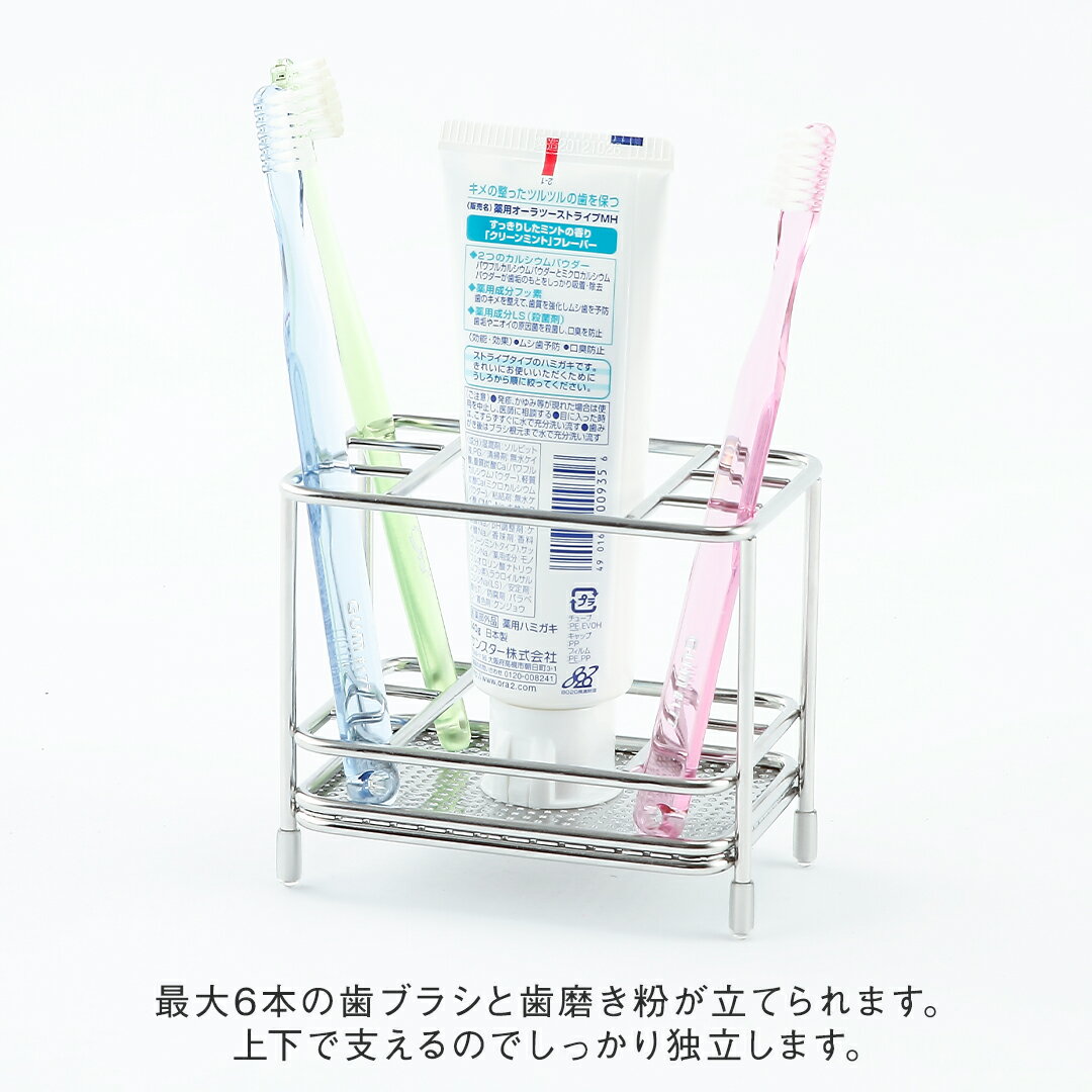 家族みんなの歯ブラシを、ひとまとめにすっきりできる歯ブラシスタンド。最近は1本ずつ分けて置くスタイルが人気ですが、ご家族分を並べたり、複数本の歯ブラシを使い分けている場合、場所を取ってしまうことも。このハブラシスタンドは、最大6本の歯ブラシと歯磨き粉をコンパクトに、しかもそれぞれ独立して立てられる設計で、省スペースと使いやすさを両立しています。Point・ 上下2箇所で仕切りをつけているので、歯ブラシ同士が触れにくい衛生的な構造 上の仕切りより、下の仕切りの方が小さくなっています。歯ブラシが直立しやすいポイント・底面はメッシュで水が溜まりにくく、乾きやすい・ステンレス素材で清潔感があり、ぬめりにくい・ 滑り止め付きで安定感抜群・家族全員分を、ひとつにすっきりまとめられる収納力サイズ:W11.7×D7.3×H10.3cm/重量=約238g材質:本体=18-8ステンレス鋼/滑り止め=PVC仕上げ:電解研磨仕上げ生産国:中国【取扱い上の注意】・用途以外の使用はさけてください。破損してケガをするおそれがあります。 ・衝撃的な力をかけないでください。 ・食器用洗剤などで洗ってからご使用ください。・白い斑点が出ることがありますが、これは水道水中に含まれるカルシウム、マグネシウムなどの成分が残り付着したものですので無害です。・使用中やお手入れの際は、製品の先端およびエッジ部分でケガをしないようご注意ください。・表面にセロハンテープ、シールなどを貼らないでください。変色、色落ち、汚れの原因になります。 ・重い物を置かないでください。 変形したり、転倒するので危険です。 ・壊れやすいものをのせないでください。・鉄やアルミなどの金属製品と長時間触れさせると、サビますのでさけてください。【お手入れ】・汚れは柔らかいスポンジを使い、食器用洗剤などでよく洗い落としてください。・ベンジン、シンナー、アルコールなどの有機溶剤、酸やアルカリ性の洗剤などは使用しないでください。・たわし・みがき粉でみがくとキズがつくことがありますのでさけてください。・サビが発生した際は、クリーム状のクレンザーを柔らかいスポンジなどにつけてこすり落とし、よくすすいでください。