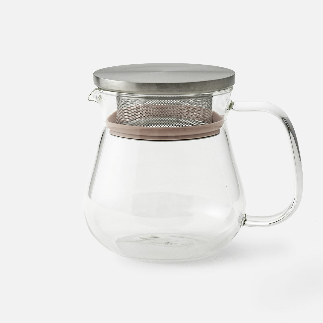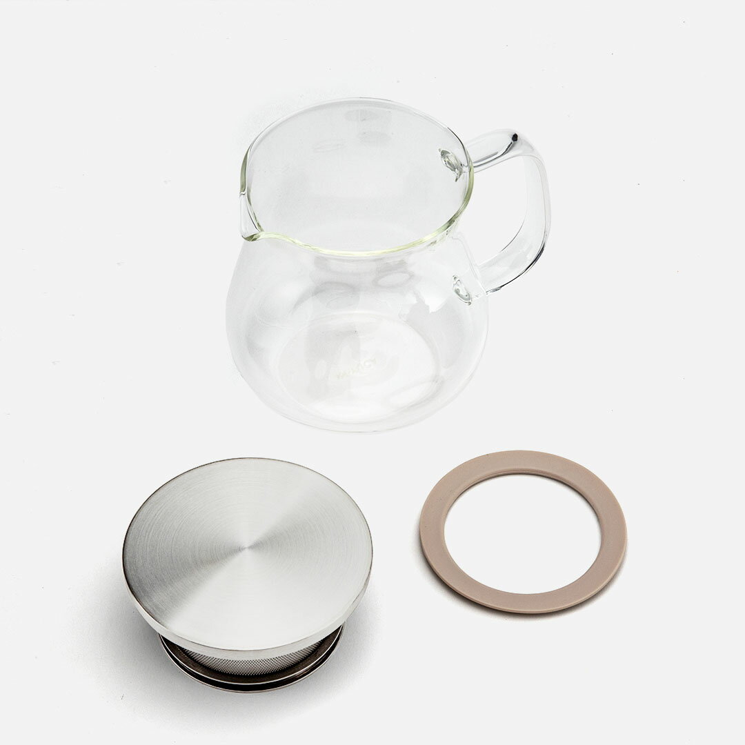 蓋に茶漉しが付属しており、簡単にお茶が淹れられるガラスポットです。茶葉がジャンピングしやすい丸い形になっています。水出し、熱湯どちらもご使用いただけます。電子レンジ使用可○(ガラスのみ)食器洗い乾燥機使用可〇(ガラスのみ)※食器洗浄機・食器乾燥機をご使用の際は、機内でガラス同士がぶつからないようご注意ください。破損の原因となります。サイズ:W10.5×D14.4×H12cm/適正容量=420ml、満水容量=600ml/重量=約280g材質:本体=耐熱ガラス(耐熱温度差120℃)/フタ=18-8ステンレス鋼/パッキン=シリコーンゴム生産国:中国【取扱い上の注意】・使用区分を超えてのご使用はおやめください。破損し、やけどやけがの原因となります。・調理の際は外滴を拭い、途中で差し水をするときは冷水の使用をさけ、またガラスの部分が熱くなっているときは濡れた布巾で触れたり、濡れたところに置いたりしないでください。・空だきをしないでください。・火の近くや高温になるところには置かないでください。 ・直射日光のあたる場所での長期の放置はさけてください。変形・変色するおそれがあります。・衝撃的な力をかけないでください。・用途以外の使用はさけてください。破損してけがをするおそれがあります。・お子様が使用される際は、取扱い上の注意をご指導のうえ一人では扱わせないようにしてください。また、幼児のそばで使用したり、幼児の手の届くところには置かないでください。・破損した際のお取扱いは、けがをしないよう十分にご注意ください。・破棄する際は、各自治体の指示に従い分別してください。・ガラスは割れるものです。洗浄や使用時は丁寧にお取扱いください。・ヒビ、欠け、強い擦りキズの入ったガラスは、思わぬときに破損することがありますので、使用しないでください。・ガラス器の内面を、金属スプーンなどで強くたたいたり、強くこすったりしないでください。破損の原因となります。・ステンレスは白い斑点が出ることがありますが、これは水道水中に含まれるカルシウム、マグネシウムなどの成分が残り付着したものですので無害です。・ステンレスは鉄やアルミなどの金属製品と長時間触れさせると、サビますのでさけてください。・シリコーンゴムはにおいの強い食品により、においが移ることがあります。・シリコーンゴムは色の濃い食品により、色がつくことがあります。・シリコーンゴムはキズや破損の原因となりますので、先の鋭いものには触れないよう注意してください。・食器用洗剤などで洗ってからご使用ください。・使用中やお手入れの際は、製品の先端およびエッジ部分でけがをしないようご注意ください。・食器洗浄機・食器乾燥機で使用できます。・食器洗浄機・食器乾燥機をご使用の際は、機内でガラス同士がぶつからないようご注意ください。破損の原因となります。・使用する食器洗浄機・食器乾燥機の取扱説明書を十分にご確認のうえ、ご使用ください。・ガラスのみ、電子レンジでの加熱ができます。・使用する電子レンジの取扱説明書を十分にご確認のうえ、ご使用ください。【お手入れ】・汚れは柔らかいスポンジを使い、食器用洗剤などでよく洗い落としてください。・ガラスの汚れがひどいときは「家庭用漂白剤」を薄めてご使用ください。その際「家庭用漂白剤」の取扱注意事項を必ずお守りください。漂白後は十分に水洗いしてください。・クレンザーやガラスにキズのつく研磨剤、または研磨粒子がついているスポンジ、たわしなどは使用しないでください。キズがついたり、思わぬときに破損する原因となります。・ベンジン、シンナー、アルコールなどの有機溶剤、酸やアルカリ性の洗剤は使用しないでください。・ステンレスにサビが発生した際は、クリーム状のクレンザーを柔らかいスポンジなどにつけてこすり落とし、よくすすいでください。・シリコーンゴムは独特のにおいがすることがありますが、食品衛生上、問題はございません。気になる場合は、沸騰したお湯に5分程度つけていただくとにおいは薄くなります。
