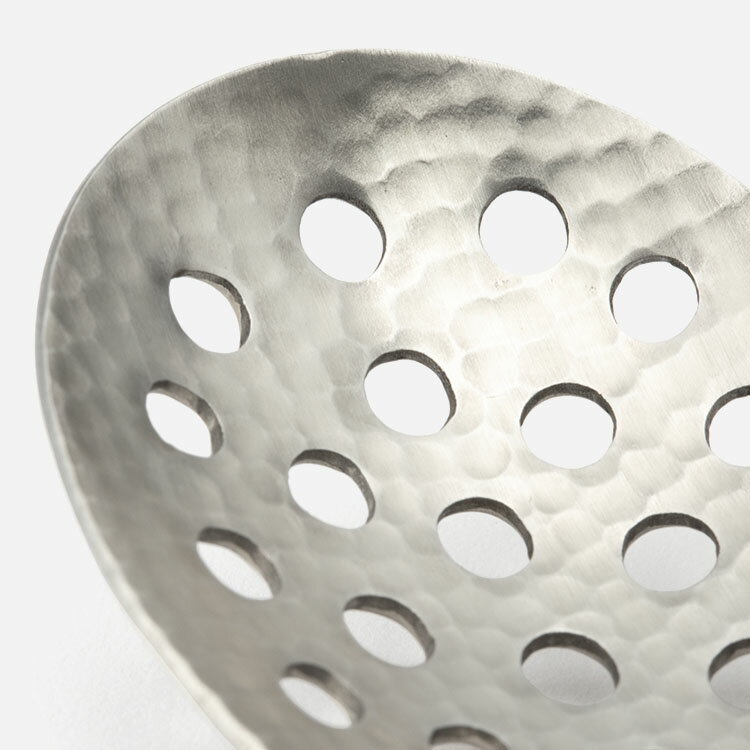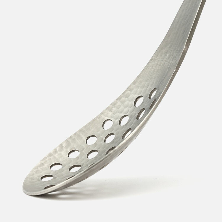 鍋の具をすくったり、ラーメンのコーンをすくうのに便利な穴あきのレンゲです。 機械で全体的に槌目を付けた後、職人が1本ずつすくう部分の凹凸を少なくするために研磨し口あたりを良くしています。 食器洗い乾燥機使用可○サイズ:W18×D3.8×H2.2cm材質:18-8ステンレス鋼生産国:日本【取扱い上の注意】・用途以外の使用はさけてください。破損してケガをするおそれがあります。・衝撃的な力をかけないでください。・食器用洗剤などで洗ってからご使用ください。・白い斑点が出ることがありますが、これは水道水中に含まれるカルシウム、マグネシウムなどの成分が残り付着したものですので無害です。・使用中やお手入れの際は、製品の先端およびエッジ部分でケガをしないようご注意ください。【お手入れ】・汚れは柔らかいスポンジを使い、食器用洗剤などでよく洗い落としてください。・ベンジン、シンナー、アルコールなどの有機溶剤、酸やアルカリ性の洗剤などは使用しないでください。・たわし・みがき粉でみがくとキズがつくことがありますのでさけてください。・サビが発生した際は、クリーム状のクレンザーを柔らかいスポンジなどにつけてこすり落とし、よくすすいでください。