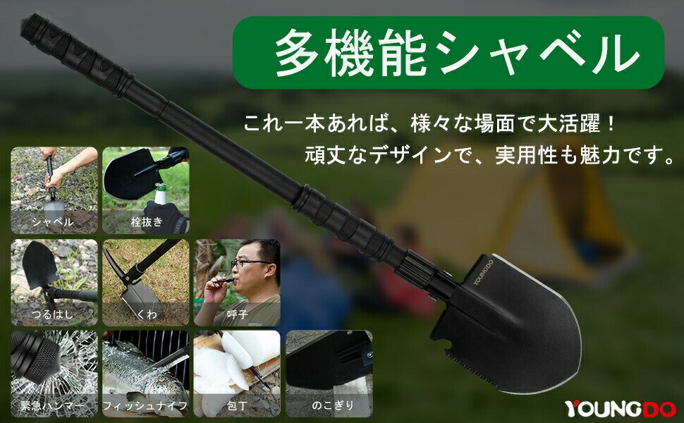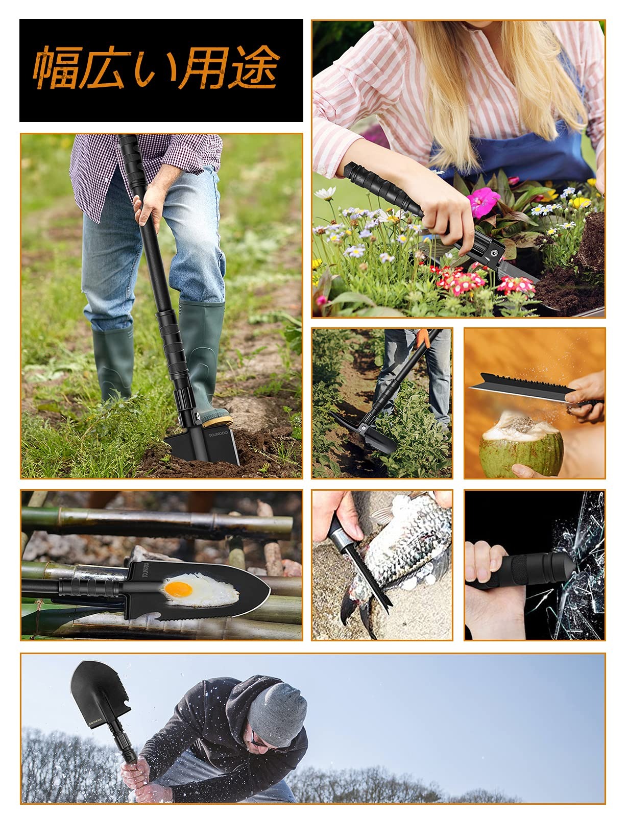 商品詳細 商品仕様 材質:合金鋼 焼入硬度:42〜48℃ サイズ:62cm 折りたたみ長さ:19cm 製品重量:750g パッケージ重量:880g 梱包サイズ:19.5 × 13 × 8 cm スコップ:園芸、穴掘り、除雪に適用です。 つるはし:穴を掘ったり、硬い土を掘り起こしたりする場合に利用できます。 シャベル:園芸、穴掘り、除雪に最適です。 栓抜き :瓶などの栓を抜くことができます。 緊急用ハンマー:万が一の時、氷を砕いたり窓を打ち破ったりすることが可能です。 ホイッスル:アウトドアで信号を送信することができます。 おすすめポイント 【多機能スコップ】シャベル、スコップ、雪かき、ノコギリ、クワ、つるはし、緊急ハンマー、アイスピック、救助笛、栓抜き、釘抜き、レンチなど多役実現できるスコップです。登山、台風、大雨、雪災など対策、アウトドア、園芸、遠足などにも活躍。また頑丈な緊急ハンマーとして、事故や災害などの緊急状況で脱出するに使っても有効です。 【長さ調整可能&角度調整可能】YOUNGD多機能シャベルは用途によって長さが34/47/63cmの3段階に調節できます。縮めると園芸の時につかえるスコップとして、長くすれば穴掘り・雪かき用として使うことができ、用途に応じて長さ調節をすることで作業効率がUP!角度も45〜180°に変えることができるのでツルハシやクワとして使うこともできます。 【携帯性バツグン!】収納袋付きでアウトドアで使う場合など持ち運びやすく、車に入れておいても邪魔になりません。アウトドアキャンプに最適で、自動車の緊急用道具として、またガーデニング作業、移植作業、室内菜園、小型鉢植え、盆栽などにも適しています。携帯性の高いシャベルやスコップを選べば、アウトドアでも家でも使えてお得です。 【高品質スコップ&人間工学に基づいたデザイン】高品質な高合金鋼の素材を採用しております。表面を防錆処理し、耐久性と硬さに優れています。 また人間工学に基づいた設計のため、持ち手には滑り止めの加工をしており、握りやすくグリップ性バツグンで快適に使用できます。 注意事項 ※ご利用のパソコンなどの解像度の影響で、色差がある可能性があり、予めご了承くださいませ。 検索関連キーワード(商品の説明ではありません) YOUNGDO 多機能シャベル スコップ 折りたたみスコップ 3段階調整可能 緊急ツール 災害対策 車載スコップ つるはし アウトドア ガーデニング 除雪 園芸 サバイバル 収納バック付き メーカー希望小売価格はメーカーカタログに基づいて掲載しています