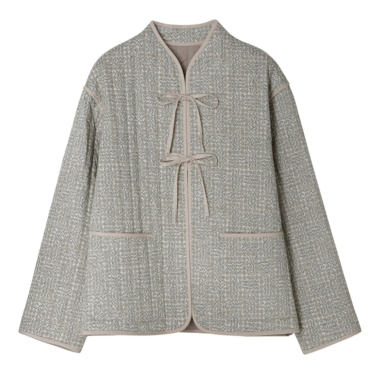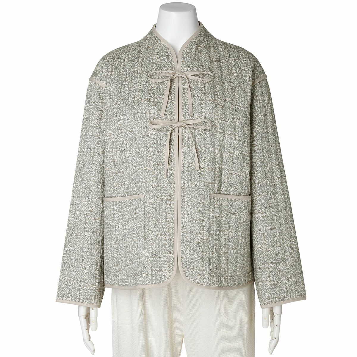 リバティ社が開発したコットン100%のタナローン地をキルト加工にした珍しい仕立てのトップスシリーズ。キルト部分はストライプ状にジグザグステッチを施し細部までこだわりました。ステッチがさりげないアクセントになった特別な一着です。アイボリーは手書き風の様々な線で描かれ規則的に並ぶバラが美しい「スリーピングローズ」。オレンジは密集した花々を描いた代表的リバティ柄の「チャイブ」。フロントのリボンがアクセントになった長袖トップス。外側の結びリボンを引き立てるため、ボタンは内側に配置しました。肌側で留める仕様にすることで、外からはすっきりとした印象に。ディティールにこだわりながらも上品でシンプルに仕上げ、羽織るだけで様になるアイテムでワンマイルにも。同素材のドッグウエアもお作りしているので愛犬とのペアコーデもおすすめ。KID BLUE / キッドブルー 【素材】本体:表側 綿100% 裏側 綿100% 中わた ポリエステル100% パイピング部分 ポリエステル100%【特徴】長袖 ポケット有り 着丈cm 身幅(1/2)58cm 肩幅50.6cm 裄丈78.3cm【サイズ】M画面上と実物では多少色具合が異なって見える場合もございます。ご了承ください。メーカー希望小売価格はメーカーサイトに基づいて掲載しています[20250912]COLOR VARIATIONアイボリー[302]オレンジ[330]