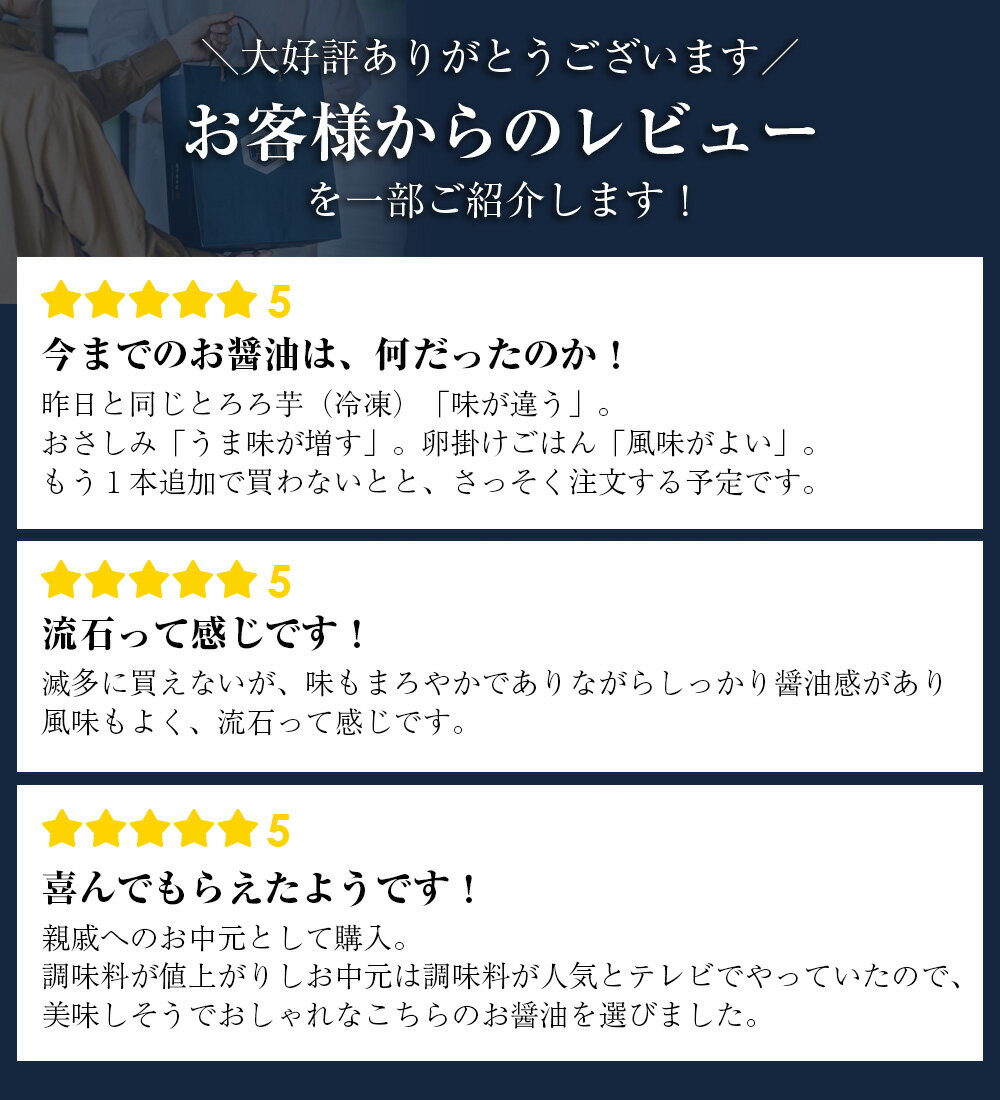 商品情報 商品名 亀甲萬本店 御用蔵生 商品説明 一年に一度だけの格別な味わいの「御用蔵」 食塩水の代わりに「御用蔵」を贅沢に使って仕込む二段熟成のしょうゆです。生しょうゆの穏やかな香りとしぼりたての新鮮さが素材の味わいを一層引き立てます。手間ひまを惜しまず丹念に仕込まれた超特選の味わいは、晴れやかなシーンや贈答に相応しい最高品質の逸品です。 ※本商品は化粧箱に入れてお届けします。更に包装や熨斗が必要な場合は、ご注文内容の確認画面にて、「ラッピング・のし」からご選択ください。 名称 さいしこみしょうゆ(本醸造) 原材料名 大豆(新潟県産)、小麦(群馬県産)、食塩(国内製造) 内容量 300mlびん×1本 栄養成分表示(大さじ1杯(15ml)当り) エネルギー20kcal、たんぱく質1.8g、脂質0g、炭水化物2.9g(糖質2.7g、食物繊維0.2g)、食塩相当量2.4g ギフト対応 可 ※納品書は付属しません 製造所 キッコーマンフードテック株式会社 千葉県野田市野田178 保存方法 直射日光を避け常温で保存してください。 開栓後は冷蔵庫に保存し、お早めにご使用ください。 アレルギー特定原材料等(28品目) 小麦、大豆 ご注意 ・びんは破損しやすいので、取り扱いには十分ご注意ください。 ・賞味期限とは、開栓前のおいしく召しあがれる期限のことです。 賞味期間 18ヶ月*賞味期限まで3ヶ月以上の商品のみを出荷致します。 (お世話になったあの方へ、手土産需要等に) ギフト 暑中見舞い 暑中見舞 残暑見舞い 贈り物 粗品 プレゼント お見舞い お返し 新物 ご挨拶 引越ご挨拶 贈答品 贈答 高級 手土産 手みやげ ちょっとした 贈り物 プチギフト (季節の贈り物やご挨拶等に) 母の日 父の日 敬老の日 敬老 敬老祝い お誕生日お祝い バースデープレゼント クリスマスプレゼント バレンタインデー ホワイトデー お中元 御中元 中元 お盆 帰省 内祝い 御歳暮 歳暮 お年賀 年賀 御年賀 法要 記念品 父の日ギフト プレゼント ごあいさつ 季節のごあいさつ 遅れてごめんね (慶事、お祝い事の行事等に) 内祝い 内祝 出産内祝い 結婚内祝い 快気内祝い 快気 快気祝い 引出物 引き出物 引き菓子 引菓子 結婚式 新築内祝い 還暦祝い 還暦祝 入園内祝い 入学 入園 卒園 卒業 七五三 入進学内祝い 入学内祝い 進学内祝い 初節句 就職内祝い 成人内祝い 名命 退職内祝い お祝い 御祝い 出産祝い 結婚祝い 新築祝い 入園祝い 入学祝い 就職祝い 成人祝い 退職祝い 退職記念 七五三 記念日 お祝い返し お祝 御祝い 御祝 結婚引き出物 結婚引出物 結婚式 快気内祝い お見舞い 全快祝い 御見舞御礼 長寿祝い 金婚式 〔仏事、法事等に) お供 御供 お供え お盆 初盆 新盆 お彼岸 法事 仏事 法要 満中陰志 香典返し 志 年忌 法事引き出物 仏事法要 一周忌 三回忌 七回忌 お悔やみ 命日 御仏前 お供え 初盆 お供え物 お彼岸 (検索ワード) お試し サンプル おためし 送料無料 サンプル お試し お試しセット お取り寄せ ご飯のお供 ご飯の友 スイーツ 業務用 食品 大容量 業務用食材 業務用 お菓子 業務用 肉 プレゼント 実用的 ギフト 母の日ギフト スイーツ 母 食品 食べ物 誕生日 高級 誕生日プレゼント 母親 30代 40代 50代 60代 70代 80代 90代 父の日 人気 おすすめ 詰め合わせ お得 ランキング 人気 人気ランキング おしゃれ ギフトセット セット 贈答品 お返し お礼 御礼 ごあいさつ 御挨拶 お見舞御礼 お餞別 引越しご挨拶 記念日 誕生日 記念品 ゴルフコンペ コンペ景品 景品 賞品 粗品 年始挨拶 お誕生日お祝い バースデープレゼント 日本酒 焼酎 ワイン ウイスキー ビール お菓子 駄菓子 珍味 乾き物 北海道 塩分 控えめ 家飲み 宅飲み 極める 燻製 国産 スルメイカ スルメ するめ (その他 検索ワード) 気軽に ご自宅で楽しめる お取り寄せグルメ お取り寄せスイーツ お家グルメ グルメ かわいい おしゃれ 早割 早割り 喜ばれる セット 芸能人 御用達 食べ物 食品 テレビ メディア 出産 喜ばれる お盆セット高級 帰省 帰省土産 土産 手土産 ホワイトデー お返し お菓子 御菓子 おしゃれ おもしろ 2024 高級 本命 義理 大量 お配り お返し物 チョコ以外 退職 お礼 退職祝い 大量 女性 男性 プチギフト お礼 メッセージ 上司 父 定年 お礼の品 お世話になりました 実用的 母の日ギフト スイーツ 母 誕生日 誕生日プレゼント 男性 女性 母親 父親 母の日ギフトセット 暑中見舞 残暑見舞い 賞品 景品 引越し お母さん お父さん 祖父 祖母 おじいちゃん おばあちゃん 冷凍食品 保存食 缶詰 業務用冷凍食品 おかず 訳あり 野菜 一人暮らし 時短 冷食 調理冷凍 ご飯のお供 非常食 惣菜 お惣菜 冷凍 おかず 応援 在庫処分 半額 割引 SALE セール 支援 福袋 恵方巻 恵方巻き 海鮮 予約 節分 訳あり わけあり ワケアリ 食品 食品ロス フードロス フードロス削減 おつまみ グルメ福袋 福袋 福袋 海鮮福袋 丑の日 土用 土用の丑の日 お取り寄せ 業務用 業務用食材 お徳用 肴 魚 おかず 野菜 常温 常温保存 保存食 調理 ふるさと納税 低カロリー ダイエット やわらかい 柔らかい