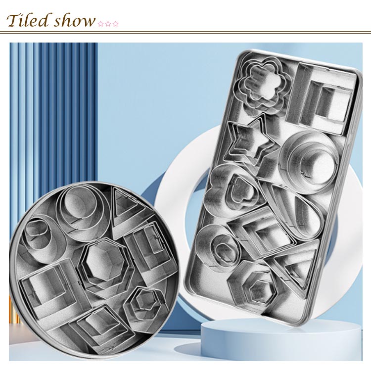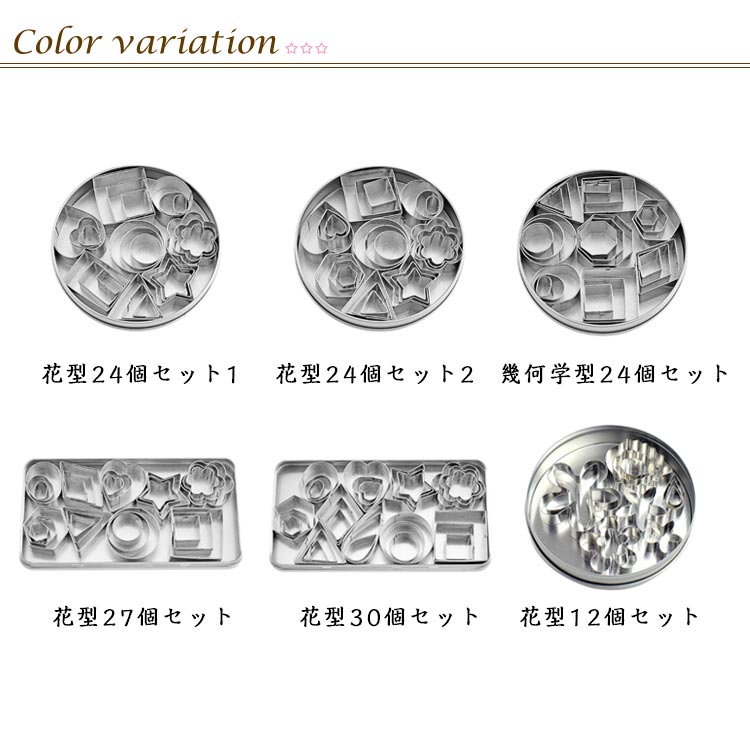 お花&幾何学型12個/24個/27個/30個セット選べるクッキー型セット収納ケース付き食品用ステンレスで製作され、さびにくく、高温対応で耐久性に優れ、衛生的なクッキー型抜きセットです。パン、チーズ、果物、野菜、クッキー、ケーキ、チョコレート、キャラ弁、粘土など手作りの抜き型として使用できます。汚れの落としやすいステンレス製で引き裂きやすく、掃除が簡単。ステンレス製の包装ケースで収納にもプレゼシトにも最高!楽しくお菓子を作り、お子様と一緒におうち時間をお楽しみください。 サイズ収納ケース付きサイズについての説明※商品のサイズは手作業で測定させて頂いておりますので、若干の誤差があります。素材ステンレス色花型24個セット1 花型24個セット2 幾何学型24個セット 花型27個セット 花型30個セット 花型12個セット備考●サイズ詳細等の測り方はスタッフ間で統一、徹底はしておりますが、実寸は商品によって若干の誤差(1cm・3cm )がある場合がございますので、予めご了承ください。●製造ロットにより、細部形状の違いや、同色でも色味に多少の誤差が生じます。●パッケージは改良のため予告なく仕様を変更する場合があります。▼商品の色は、撮影時の光や、お客様のモニターの色具合などにより、実際の商品と異なる場合がございます。あらかじめ、ご了承ください。▼生地の特性上、やや匂いが強く感じられるものもございます。数日のご使用や陰干しなどで気になる匂いはほとんど感じられなくなります。▼同じ商品でも生産時期により形やサイズ、カラーに多少の誤差が生じる場合もございます。▼他店舗でも在庫を共有して販売をしている為、受注後欠品となる場合もございます。予め、ご了承お願い申し上げます。▼出荷前に全て検品を行っておりますが、万が一商品に不具合があった場合は、お問い合わせフォームまたはメールよりご連絡頂けます様お願い申し上げます。速やかに対応致しますのでご安心ください。 メーカー希望小売価格はメーカーカタログに基づいて掲載しています