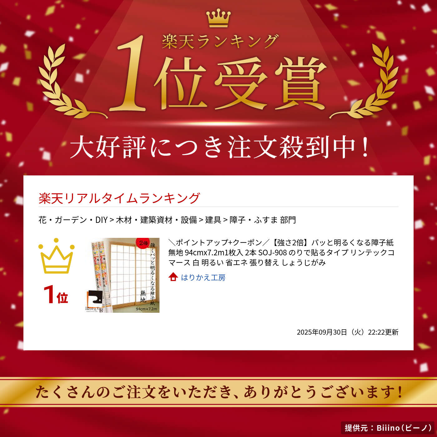 品質表示 商品名 パッと明るくなる障子紙 製法 機械漉き 材料 パルプ 80% ポリエステル 17% ビニロンバインダー 3% 紫外線カット剤配合、蛍光剤配合 模様 無地(SOJ-908) 寸法 紙巾94cm×紙長7.2m 2本 障子8枚分 貼り方 のりを使って貼るタイプ→のりで貼る方法 ホルムアルデヒドは含まれておりません \届いたらすぐに貼り替えスタート!!/ ※セットは、4枚分のワンタッチ糊が、2個ついています 必ずお読みください 本品は、障子紙のJIS規格(P8112)に規定された破裂強さの下限値に比べて2倍の強さです。 本品の白色度は、障子紙のJIS規格(P8123)に規定された破裂強さの下限値に比べて20%高く室内が明るく感じられます。 UVカット加工により紫外線を約90%カットし、室内の色あせ・変色を防止する効果があります。 障子紙専用のでんぷん糊、または両面テープをご使用ください。 ☆商品のパッケージに詳しい貼り方ガイドが載っています。 関連商品 障子張り道具など ・ワンタッチ障子のり(破れにくい紙用) ・障子のり ・のり刷毛 ・障子紙ナイフ ・カッターガイド ・障子用はがし剤 ・障子用両面テープ ・ローラー ※置き配をご希望の場合は、「置き配:宅配BOX」や「置き配:玄関前」など、具体的な場所もご指定ください。宅配BOXに入らない場合やご記入がない場合は、置き配ではなく、通常配達に変更となります。ご了承ください。\もっと強い障子紙はこちら / 注目キーワード リフォーム DIY 大掃除 暮れ 12月 転居 引っ越し 新生活 新学期 白 大容量 卒業 リビング 客間 応接室 茶室 家具 模様替え リメイク セルフ リンテックコマース
