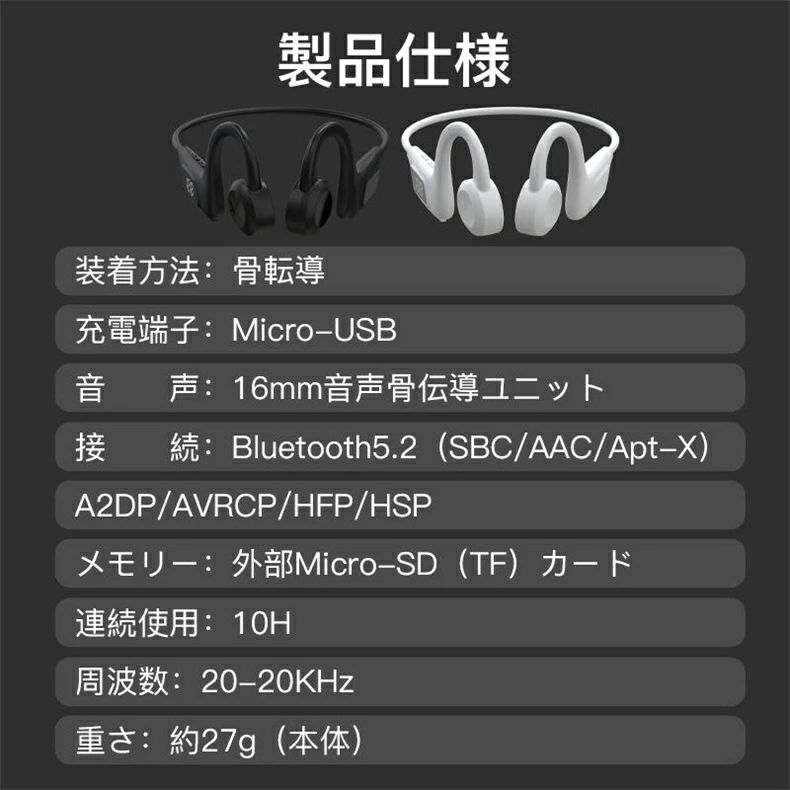 次世代の骨伝導式bluetoothイヤホン、「骨を通して音が聞こえる」仕組みを採用し、耳の穴を塞がないので周囲の音を聞きながら使えて、耳の中に圧迫感がありません。耳の穴が小さくても使えて、イヤホンが抜けてくる心配もありません。電話する時に自分の声が響かず、自然な音質に聞こえます、骨伝導マイクを使うと、工事現場など騒音が大きい場所で通信するときの音質が改善します。★痛くない、抜けない、運動しやすい、周りの音が聞こえる等、最新型の高性能高音質仕様、マイク付き。★Bluetooth5.2を採用、音質向上、通信も安定性、省エネに改善。■主な仕様・音声:大型16mm骨伝導ユニット・マイク:マイク内蔵・メモリー:外部Micro-SDカード対応・接続:bluetooth5.2(SBC/AAC/Apt-X)、A2DP/AVRCP/HFP/HSP・連続使用:10H再生、150H待受け・充電端子:Micro-USB・カラー:ブラック、ホワイト・重さ:約27g(本体)メーカー希望小売価格はメーカーサイトに基づいて掲載しています
