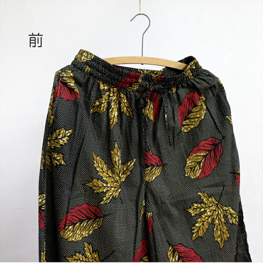 タグ:#アフリカンプリント #同じ形 アフリカンプリント イージーパンツブラック 裏地付き ウエストゴム ワイドパンツ品 番ta2143-lサイズウエスト62-108cm股上26cm股下66cmヒップ114cm材 質綿100%制 作インドバナナや植物のアフリカンプリントが目を引くシリーズ。 リラックス感のあるイージーパンツは、シンプルなトップスと相性抜群。 ウエストはゴム仕様になっていて、全面に柔らかなコットンの裏地もついているので、肌触りよく、履き心地の良い一枚です。便利なポケット付き。同じ柄のワンピースありKEY:African wax printe, アフリカンプリント、アフリカンテキスタイル、テキスタイル、ワンピース、コットンファブリック、パーニュ布⇒パーニュxJAPAN