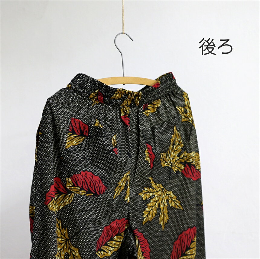 アフリカンプリント イージーパンツブラック 裏地付き ウエストゴム ワイドパンツ