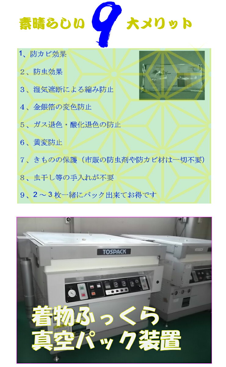 洗い料金別脱酸素状態で窒素ガスを注入いたします ■ 防カビ・防虫効果 ■ 湿気遮断による縮み防止 ■ 金銀箔の変色防止 ■ ガス退色・酸化退色の防止 ■ 黄変防止 ■ 虫干し等のお手入れが不要 2年間保証です(酸素センサー付き)大切な衣類を長期間保管する際の心強い味方、「安心ふっくら真空パック」。 このパックは、真空状態で窒素ガスを注入し、衣類を湿気や虫害から守ります。 防カビ・防虫機能に加え、湿気遮断による縮み防止、箔の変色防止、ガス退色・酸化退色の防止、黄変防止といった衣類の品質を維持するための機能が満載です。 さらに、虫干しなどの手間を省けるため、忙しい方や手入れが難しい衣類の保管にも最適。 2年間の保証が付いており、酸素センサーが品質を見守ります。 レビュー評価も高く、4.56という信頼の証。 洗い料金は別途必要ですが、その価値は十分にある、衣類保管の新しいスタンダードを提案します。 お手入れが不要で、衣類を長持ちさせるこの真空パックで、大切な衣類を次のシーズンまでしっかりと守りましょう。