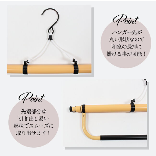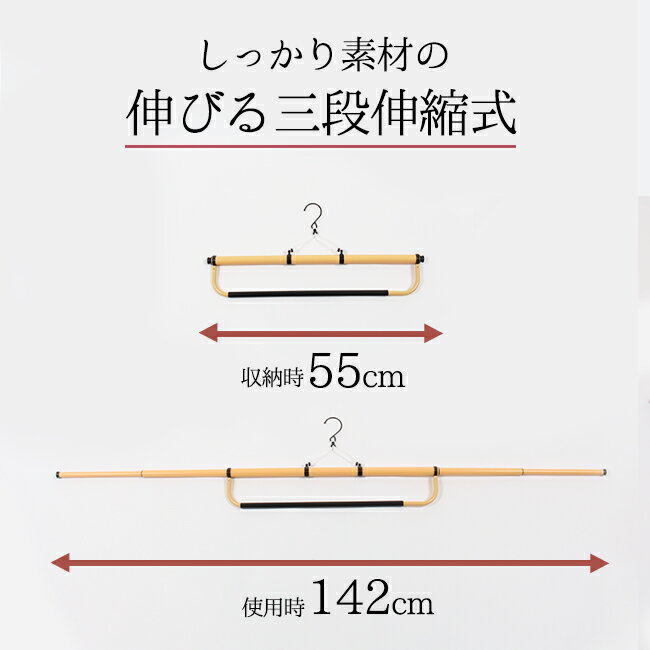 着物用のハンガーです。 お着物を脱いだ後はシワなく干せる専用のハンガーで陰干しのお手入れをしましょう。 汗をかいたり、埃がついたりしたままにしてしまうと、きものの寿命を縮めてしまいます。 着用前に掛けることで、たたみジワとりにも活用できます。 着物ハンガーの中では、一番耐久性のあるタイプで、 帯掛け付きなので、帯や帯揚げ、帯締めなどの小物も掛けられ、使いやすく大変便利です。 55cm~142cmまで伸びる三段伸縮タイプ。 フックがスチール製なので、重さにも耐えられ、最大荷量も約13.3kgです。 折り畳むと大変コンパクトに収納でき、化粧箱入りなので、プレゼントにもご利用いただいております。 商品詳細情報 素材 本体/硬質PVCパーツ(ABS樹脂)フック/スチール サイズ(使用時) 約142cm × 10.5cm サイズ(収納時) 約55cm × 10.5cm サイズ(帯掛け) 約47cm (滑り止め部分) 約40cm 関連商品 収納・お手入れ用品・その他小物一覧⇒ きものハンガー126cmはコチラ⇒ 備考 日本製 耐荷量13.3kg メール便不可 梱包サイズの関係上、緩衝材でくるんだ簡易包装となります。 配送中、外箱の角折れ等が生じる場合がございます。 予めご了承よろしくお願いいたします。 関連商品 お得な2本組セットはコチラ 126cmタイプはコチラお着物を脱いだ後はハンガーで陰干しのお手入れを。 着物用のハンガーです。 お着物を脱いだ後はシワなく干せる専用のハンガーで陰干しのお手入れをしましょう。 汗をかいたり、埃がついたりしたままにしてしまうと、きものの寿命を縮めてしまいます。 着用前に掛けることで、たたみジワとりにも活用できます。 着物ハンガーの中では、一番耐久性のあるタイプで、 帯掛け付きなので、帯や帯揚げ、帯締めなどの小物も掛けられ、使いやすく大変便利です。 55cm~142cmまで伸びる三段伸縮タイプ。 フックがスチール製なので、重さにも耐えられ、最大荷量も約13.3kgです。 折り畳むと大変コンパクトに収納でき、化粧箱入りなので、プレゼントにもご利用いただいております。 こちらの商品ページはきものハンガー単品の商品ページとなります。 お得な2本セットのご購入は→コチラ←をお求め下さい。