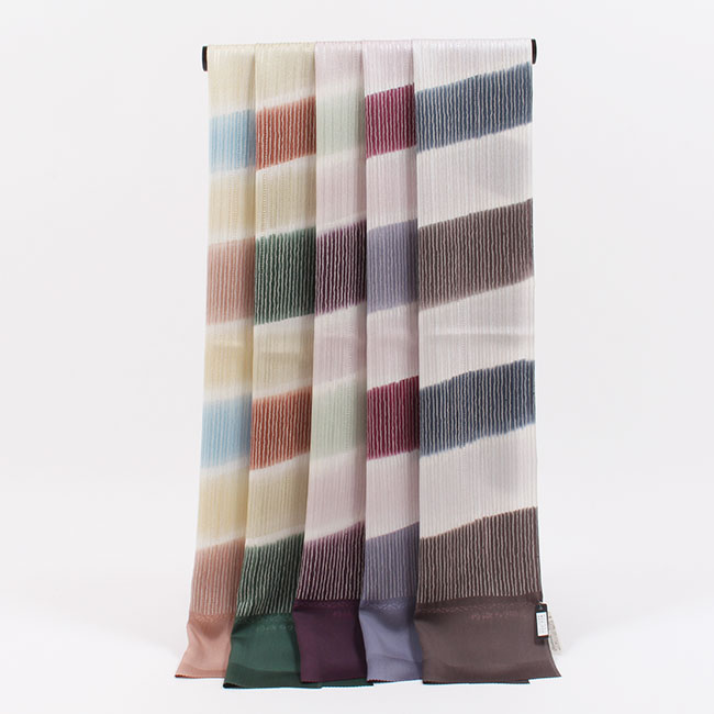 商品詳細情報 素材 絹 100% サイズ 約1m80cm × 約30cm 関連商品 帯揚げ一覧【和小物さくら】 帯揚げ ろうけつ染め 多色斜めぼかし よろけ縞 丹後ちりめん 日本製 小紋や紬に合わせる、お洒落な帯揚げ。 きもの 和〈なごみ〉がセレクトした、美しいろうけつ染めの帯揚げのご紹介です。 京都の伝統技術と現代的な感性を融合させたものづくりで知られる「和小物さくら」の帯揚げ。 目を引くのは、絶妙な色彩で描かれた斜めぼかしと、モダンな感覚が息づく「よろけ縞」模様。 多彩な色の重なりが美しく、思わず見惚れてしまうような上品な一枚です。 一見シンプルに見えるよろけ縞ですが、ろうけつ染めならではの奥行きと味わいが魅力。 繊細な色合いで仕上げられているため、さまざまなお着物に合わせやすく、幅広い装いに活躍してくれます。 小紋や紬などのカジュアルな和装スタイルにもぴったり。 コーディネートを格上げしてくれる帯揚げとして、ぜひお手元に加えてみてはいかがでしょうか。 よろけ縞の柄は、ろうけつ染めならではの味わい深さがあり、どこか趣のある佇まい。 さらに、一色一色が丁寧に染め上げられており、それぞれに深みのある美しい色合いが魅力です。 全体にモダンな雰囲気が漂い、洗練された印象を与えてくれます。 お好きなお色をお選び下さいませ。 画像クリックで拡大します。 この商品のカテゴリ一覧へ(柄もの帯揚げ一覧) 合わせる帯締め一覧(カジュアル向き帯締め一覧)