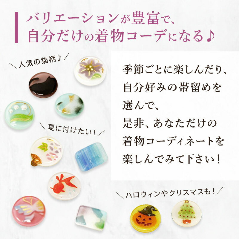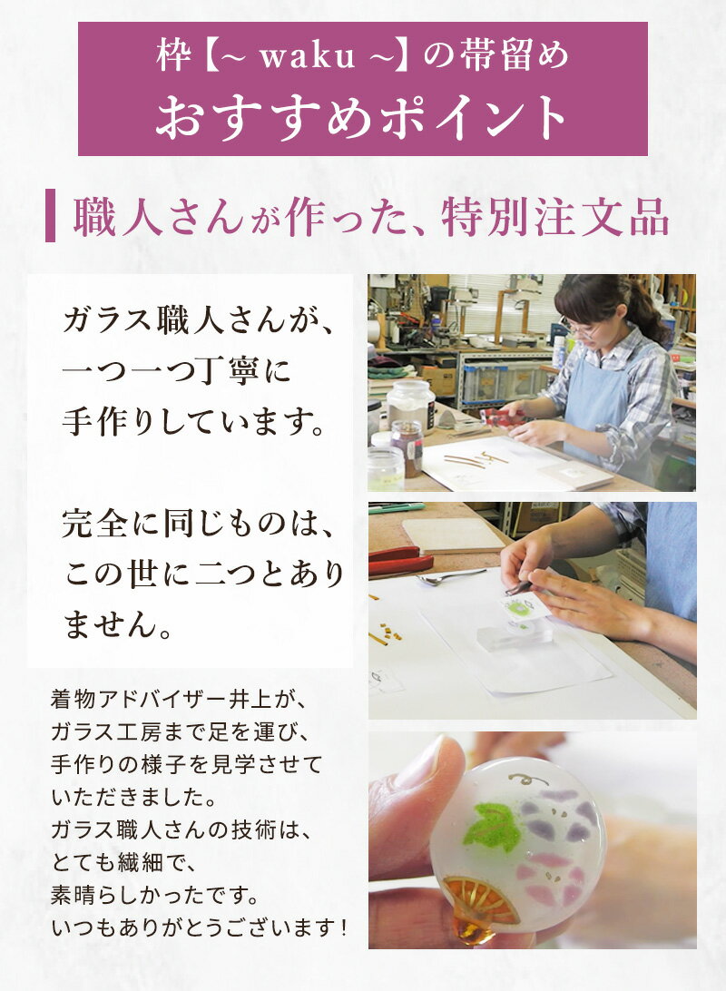 商品詳細 素材 素材;本体:ガラス 帯留め用金具:金属 サイズ サイズ; 本体:直径 約3.3cm 高さ:約1.3cm(金具部分を含む) 注意書き ※こちらは帯留め用の金具が付いているタイプです。二分紐・三分紐・四分紐を通してお使い下さいませ。 ※モニターの発色具合によって、実際のものと色が異なる場合がございます。【枠 〜waku〜】オリジナルで、お正月バージョンを制作して頂きました! ガラス職人さんが、ひとつひとつ、丁寧に作って下さいました! 完全に同じものは、この世に二つとありません! お正月にこの帯留めをつけて、普段着の着物のお洒落をご満喫頂けましたら、とっても嬉しいです! 画像と多少の色味の違いや、気泡の入り方の違いが生じる場合が ございます。何卒ご了承下さいませ。 ※こちらは帯留め用の金具が付いているタイプです。 二分紐・三分紐・四分紐を通してお使い下さいませ。(普通の平組の帯〆は、 厚みがあり房も大きいので通しにくいです。帯留め用の紐をオススメします。) 【品質表示】 素材;本体:ガラス 帯留め用金具:金属 サイズ;本体:直径 約3.3cm 高さ:約1.3cm(金具部分を含む) ※ラッピングは承っておりません。ご了承下さいませ。 <<帯留め用金具付きの帯留めの付け方>> 1.いつも通りにお太鼓結びをして、普通の帯締めをやや下めにしっかり締めておく。 2.帯留めの裏の金具に、紐を通す。 3.帯留めの裏側(金具部分)を、前帯の中央にぴったり付け、両手で紐を後ろに回す。 4.お太鼓の中に紐を通し、しっかりと結ぶ。 (ちょうちょう結びでも、帯〆結びでも、しっかり留まればどちらでも大丈夫です!) 5.普通の帯締めをはずし、帯留めや紐の位置を整える。 ※4.の所は、前で紐を結んでから、結び目を後ろに回してもOKです。 ⇒サイズについて等、ご不安なことはお気軽にお尋ねくださいませ。 担当;井上 info@kimono-waku.com 0774-73-6665
