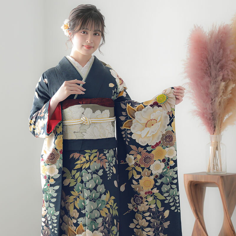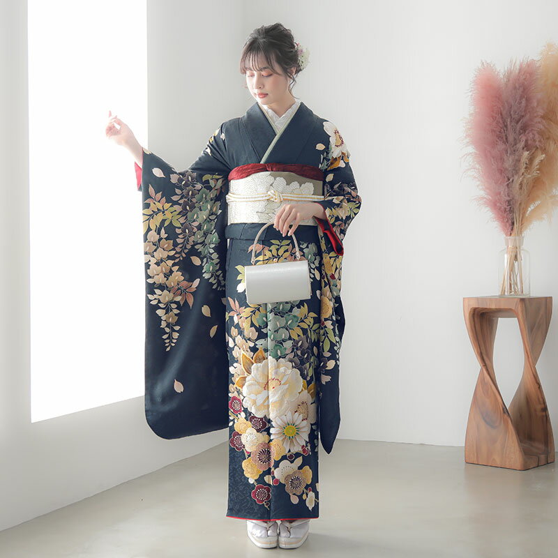 【成人式 振袖 レンタル】RS1956 正絹 黒紺 牡丹と藤花 Dear フルセット 往復送料無料 /女性和服/結婚式 和服 着物セット/小物 セット 振り袖 【レンタル】