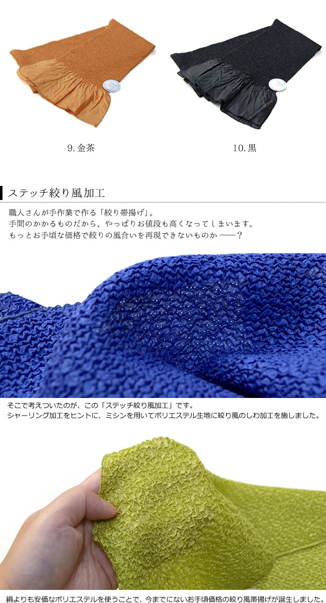 振袖用帯揚げ ステッチ絞り風帯揚げ 全10カラー 赤 緑 山吹 青 紫絞り加工前の生地サイズ:約210cm※加工の加減によりサイズが異なる場合がございます。品質:生地 ポリエステル100%企画:日本、製造:中国※加工の性質上、水濡れ、汗、摩擦で色落ち、色移りしますのでご注意下さい。 ※強い力がかかった状態が長く続くと絞りが伸びることがあります。ご注意下さい。※メール便:1枚まで可能※写真の光加減や、ご覧いただく環境によって色味が若干異なる場合がございます。kimonocafe kimono style成人式、結婚式などの振袖に。 ステッチ絞り風ポリエステル帯揚げ絞り風のしわ加工がめずらしい振袖用帯揚げです。 小さくたたんでも跡がつきにくいポリエステル生地。薄く軽い生地だから夏場でも涼しくお使い頂けます。 パッと鮮やかな発色がコーディネートのアクセントになりますよ。
