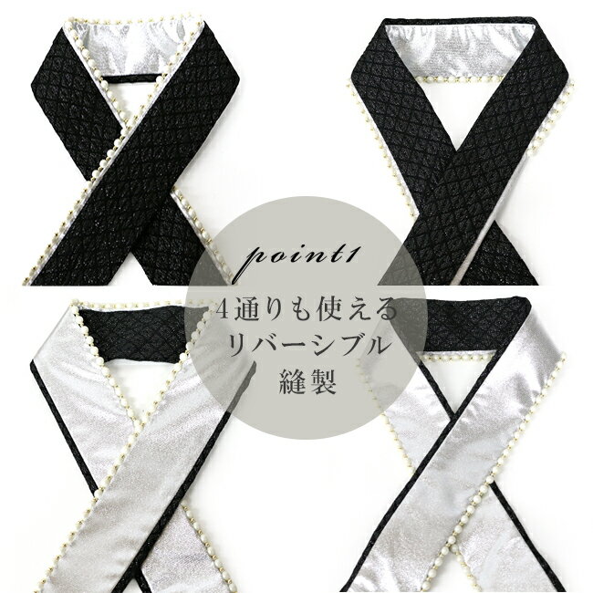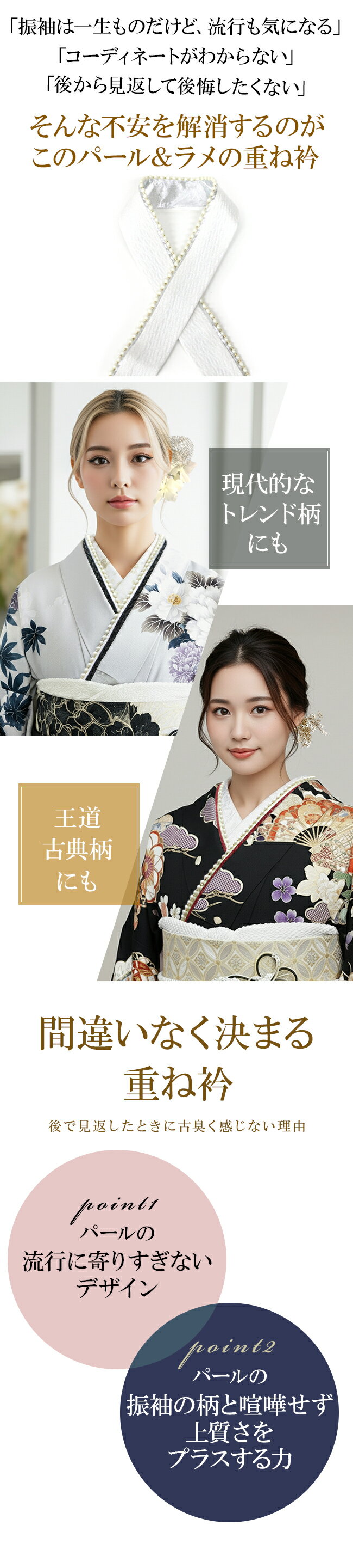 重ね衿 パール&ラメ重ね衿 振袖用 訪問着用 留袖用 重衿 重ね襟 伊達衿 ラメ パール 上品 成人式 袴素材正絹(ラメスリット糸使用)サイズ(約)巾約5cm×長さ約126cm正絹のラメ生地にパールがついた上品な重ね衿です。裏側を使うことによって4通りの付け方を楽しむことができます。着物に取り付けるピンが付属しています。従来品よりパールの長さを約10cm長くリニューアルしました。これにより、衿を大きく抜いた場合やバストが大きい場合でも、パールが途中で終わってしまうことなく、きれいにお付けいただけます。実際の生地の色合いは生地UP画像を参考にしてください。写真の光加減や、ご覧いただく環境によって色味が若干異なる場合がございます。京都の風情とともに歩んできた和装メーカー、アンドウ株式会社のネットkimonocafeは、やさしく暮らしに寄り添う和の装いを提案しています。普段から楽しめる着物をはじめ、夏を心地よく彩る浴衣や浴衣帯、下駄まで、細やかな気配りが感じられるものづくりが特長です。華やかな振袖は成人式という大切な一日を美しく演出し、帯揚げや帯締め、髪飾りなどの小物も含めて、装い全体の調和を大切にしています。また、卒業式に向けた袴スタイルでは、バッグや草履との組み合わせにも配慮し、上品でやわらかな印象に仕上げています。半衿や重ね衿といった細部にまで心を込め、日本の伝統を今の時代へ丁寧につないでいる会社です。kimonocafe kimono style後から見返したときに後悔しない。トレンド感もありつつ王道をいく!マットパールの重ね衿ラメスリット糸が入った華やかなシルクとパールの相性が抜群!トレンド柄にも王道古典柄にも似合う、振袖の失敗無しの重ね衿です。4通り使えるリバーシブル上下左右を入れ替えて使うことで4通りの装い方ができます。これ一本あれば、振袖から訪問着まで幅広くカバーします。チープなテカリ感無し。パールはマットパールを採用。光を程よく顔回りに取り込みつつ、チープ感のある派手な光り方はしない落ち着きのあるデザインです。豊富なニュアンスカラーをご用意しました。白でも、white,beige,greigeと微妙にニュアンスが違う色味を用意しています。あなたの振袖にベストなカラーがきっと見つかります。着物に付けるピンが付属しています。着物に縫い付けなくても簡単に付けられるコームタイプのピンが3つ付いています。別で用意しなくていいから楽ちん。