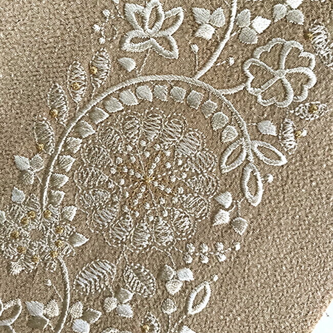 振袖用半衿 エスニック インド刺繍風 成人式 刺繍半衿 礼装用 半襟素材ポリエステル100%サイズ(約)幅約15cm×長さ約116cm 礼装用の刺繍半襟です。縮緬にエスニックなインド風刺繍を施しました。金色糸も使われていますがギラギラと目立つような感じではないので、洒落用やちょっとしたお出かけ用としても使えます。上質なちりめん生地を使用しており、絹のような見た目ですが、実際はポリエステルですので、お家で気楽に洗っていただけます。実際の生地の色合いは生地UP画像を参考にしてください。写真の光加減や、ご覧いただく環境によって色味が若干異なる場合がございます。京都の風情とともに歩んできた和装メーカー、アンドウ株式会社のネットkimonocafeは、やさしく暮らしに寄り添う和の装いを提案しています。普段から楽しめる着物をはじめ、夏を心地よく彩る浴衣や浴衣帯、下駄まで、細やかな気配りが感じられるものづくりが特長です。華やかな振袖は成人式という大切な一日を美しく演出し、帯揚げや帯締め、髪飾りなどの小物も含めて、装い全体の調和を大切にしています。また、卒業式に向けた袴スタイルでは、バッグや草履との組み合わせにも配慮し、上品でやわらかな印象に仕上げています。半衿や重ね衿といった細部にまで心を込め、日本の伝統を今の時代へ丁寧につないでいる会社です。kimonocafe kimono styleインド刺繍風、エスニック柄の刺繍半衿登場!礼装にも洒落用にも使える上品な刺繍半衿です。beigeすこし暗めのベージュですが、ミルキーな柔らかな色合いです。offwhite彩度を落とした若干暗めのオフホワイトです。明るめのクリーム色ではなく、サンド系の色味です。white地色は白、刺繍の糸はオフホワイトです。black黒地にオフワイトの刺繍です。くっきりとした印象で大変華やかな印象です。