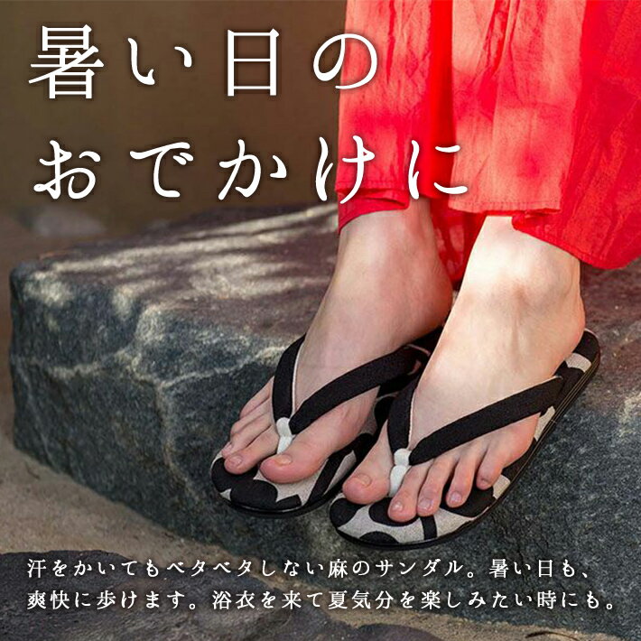 ラッキーシール対応!ポイントや豪華賞品が当たるかも!? ※G.w/お盆休み/年末年始等の長期休暇※あす楽をご指定いただいても高速道路等交通渋滞の影響、および旅客手荷物の増加等による航空機への貨物搭載制限により、お届けに最大1日程度の遅れが生じることがあります。お客様には、大変ご迷惑をお掛けいたしますが、ご理解を賜りますようお願い申し上げます。 ご確認くださいサイズ ■Mサイズ つま先からかかとまで:約24cm先坪(花緒の付け根)からかかとまで:約20cm幅:約8cmつま先の高さ:約1.5cmかかとの高さ:約2.5cm ■Lサイズ つま先からかかとまで:約25cm先坪(花緒の付け根)からかかとまで:約20.5cm幅:約8cmつま先の高さ:約1.5cmかかとの高さ:約2.5cm ※草履はかかとが台から1、2cm出るくらいが丁度よいサイズとされています 注意 ●できる限り実際の商品の色に近づけてはいますが、お使いのブラウザの環境により多少異なることがございます。商品詳細 さらっと涼しく、軽やか。麻の雪駄サンダル ●夏のおでかけにちょうどいい♪麻の雪駄サンダル ●汗をかいてもベタつかないので、暑い日も爽快に歩けます。 ●浴衣にも、自然に合わせられます。 ●足の指をしっかり使って歩けるため、普段のヒール通勤等で疲れた足をリラックスさせるのにも◎ ●片足約155g(Mサイズ)と軽量! ●足を載せる部分は、さらりと素肌に心地良い「麻」 ●足が痛くなりにくい!やさしい位置と素材の「花緒」 ●個性的でたのしい色柄!No.1「ベージュ×レッド/渦・波紋 模様」No.2「グリーン×イエロー/木の葉模様」No.3「イエロー×パープル/きび模様(花緒:阿波しじら織)」 ●和装履物の一大産地である奈良の「大和工房」にて職人がひとつひとつ手作業で作りました。 サイズ ■M つま先からかかとまで:約24cm先坪(花緒の付け根)からかかとまで:約20cm幅:約8cmかかとの高さ:約2.5cm ■L つま先からかかとまで:約25cm先坪(花緒の付け根)からかかとまで:約20.5cm幅:約8cmかかとの高さ:約2.5cm 素材 天板:太麻底:合成ゴム(黒) 花緒:No.1「渦」麻No.2「木の実」麻No.3「きび」綿 ご確認ください ●天然素材のため、麻そのものの色に一部ムラが出ている場合がございます。“風合い”として捉えていただけますと幸いです。 ●閲覧環境により画像とは若干色味が異なる可能性がございます。予めご了承くださいませ。 クレジットカード決済の他に、コンビニ前払い・後払い決済・代金引換(宅配便のみ)ご利用いただけます!