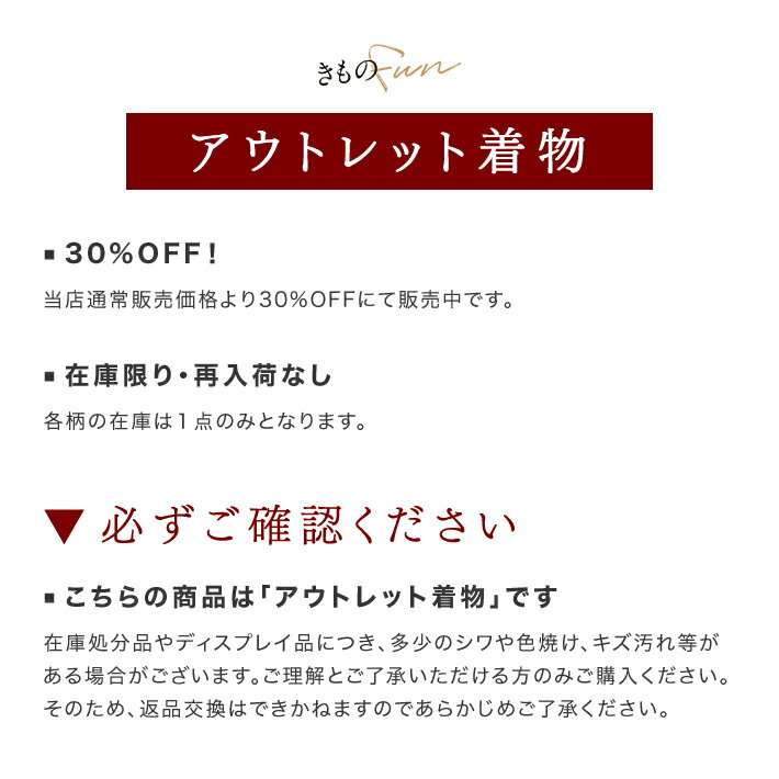商品詳細 【アウトレット】 プレタ着物(仕立て上がり品) ●定価より30%OFF!各在庫1点限り ●在庫処分品やディスプレイ品につき、多少のシワや色焼け、キズ汚れ等がある場合がございます。ご理解とご了承いただける方のみご購入くださいませ。 関連商品 他の着物はこちら!