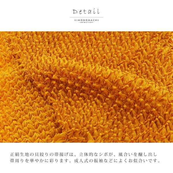 よく一緒に購入されている商品帯締め 単品 リボンレース着乃嘉 日本製 レー6,380円京袋帯 単品 数量限定 KIMONOMACHI11,550円※メール便ご希望のお客様※メール便は代引不可・日時指定不可です。ご注文の前に必ず「メール便について」をお読みください。メール便では帯揚げ2枚程度が同梱上限の目安となります。メール便はラッピング資材がシワになりやすいことをご了承ください。(ラッピングご希望の場合は通常の宅配便をおすすめいたします)正絹生地の貝絞りの帯揚げです。立体的なシボが風合いを醸し出し、帯周りを華やかに彩ります。【商品内容】帯揚げ1点【カラー】黄みの橙色【サイズ】全長約124〜150cm、幅約16〜22cm【品質】正絹生地:中国 染め:日本成人式や結婚式、お祝いの席の振袖に。※ご覧いただいている環境によって、色みが若干異なって見える場合がございます。 ※商品によって、サイズが若干前後する場合がございます。 ※商品に貼付けされている管理用シールに、入荷時識別用の名称や、簡易な名称を記載していることがございます。 そのため商品ページに記載の商品名称と異なる場合がございます。悪しからずご了承くださいませ。◇色柄違いございます◇ ◇そのほかの帯揚げはこちら◇ ◇ご一緒にいかがですか?◇ 類似商品はこちら振袖用 帯揚げ 正絹 総絞り 古典 豪華 成14,300円振袖用 帯揚げ 正絹 総絞り 古典 豪華 成14,300円振袖用 帯揚げ 正絹 古典 豪華 成人式 結8,250円振袖用 帯揚げ 正絹 古典 豪華 成人式 結9,350円振袖用 帯揚げ 正絹 古典 豪華 成人式 結11,000円振袖用 帯揚げ 正絹 古典 豪華 成人式 結11,000円帯揚げ 振袖 成人式 単品日本製 帯揚 帯あげ4,950円帯揚げ 振袖 成人式 ベロア 単品帯揚 帯あげ7,480円帯揚げ 振袖 成人式 ベロア 単品帯揚 帯あげ7,480円2026/02/18 更新