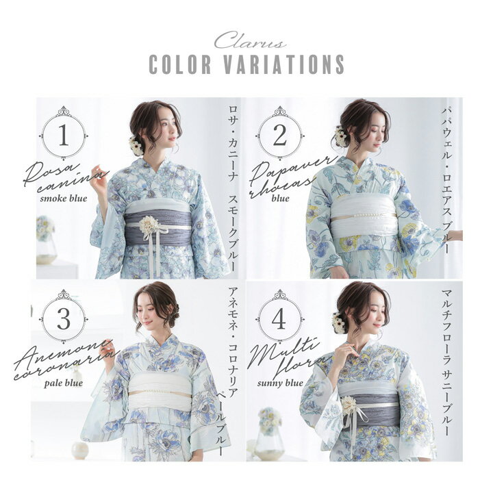 Clarus レディース 女性浴衣 単品「植物図鑑 ブルー系(寒色系)ロサ・カニーナ / パパウェル・ロエアス / アネモネ・コロナリア / マルチフローラ」F/フリーサイズ 綿浴衣 大人可愛い きもの町オリジナル 女性用浴衣 ゆかた yukata【メール便不可】yk★10%OFF