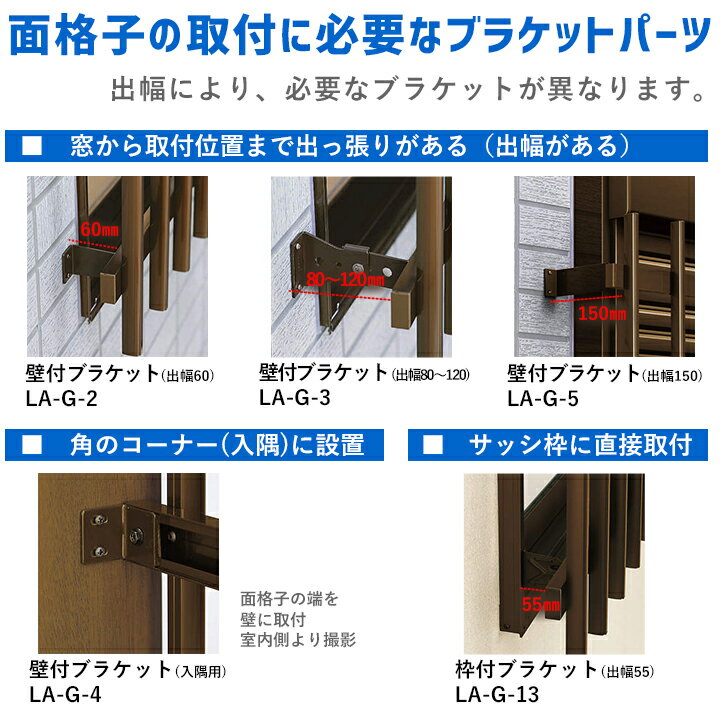メンテナンスや壊れた時に便利な面格子パーツ! こちらは、ブラケットのみの単品販売になります。面格子は別途ご購入下さい。 ■面格子とは? 面格子(めんごうし)は、窓からの侵入を防ぐ「防犯」や プライバシー保護の「目隠し」のために窓の外側に設置される部材です。 一戸建てではキッチンやトイレ、浴室といった水まわりやクローゼットの窓など 死角になりやすい位置に多く設置されています。 主な素材はアルミ・ステンレス・鋳物(いもの) デザイン性を高めたタイプで洋風の住まいに馴染む独特の風合いとデザインの面格子もあります。 その中でも、アルミ製は手入れがしやすく人気があります。 また、新築の際にサッシに取り付けるだけでなく 暮らしの中で外部環境の変化などから必要性を感じて、 後からリフォームで壁面に取り付ける場合もあり、 これに対応した取付け金具(ブラケット)も選択できます。 DIYで後付けする場合は、壁面に穴を開けて取り付ける「壁付け」より、 サッシ枠に取り付ける「枠付け」用金具(ブラケット)の方が人気があります。 雨戸がなくて不安。シャッターまでは手が出ない。という方にも好評です。 暴風で物が飛来してもある程度は防げると思います。YKK たて面格子LA 壁付サイズ表 W/H(mm) 横 920 1020 1420 1520 1820 2020 縦 400 920×400 - 1420×400 - 1820×400 - 600 920×600 1020×600 1420×600 1520×600 1820×600 2020×600 800 920×800 1020×800 1420×800 1520×800 1820×800 2020×800 1000 920×1000 1020×1000 1420×1000 1520×1000 1820×1000 2020×1000 1200 - - 1420×1200 - 1820×1200 2020×1200 1400 - - 1420×1400 - 1820×1400 2020×1400