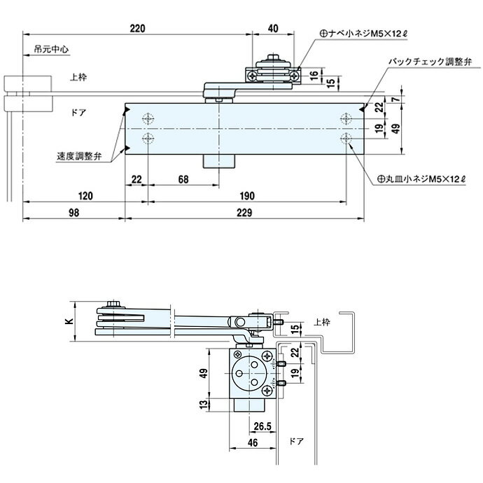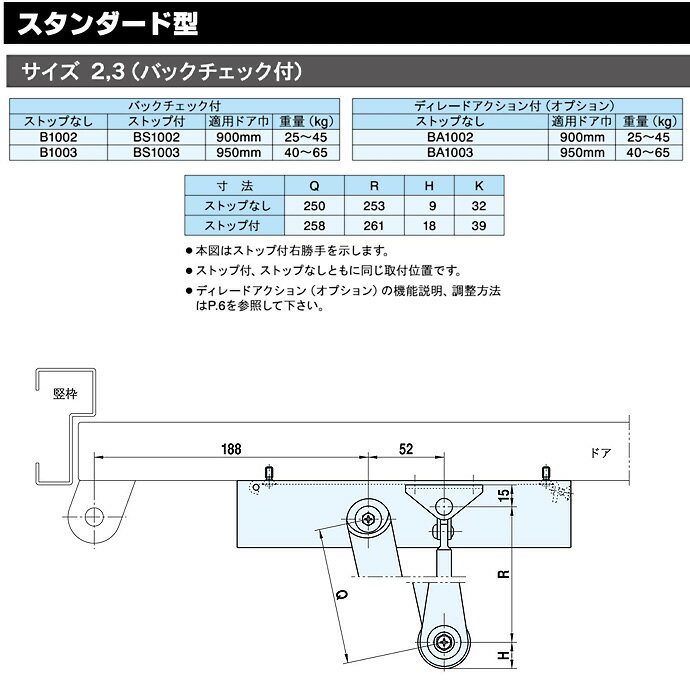 リョービ ドアクローザ #1000 BA1003 スタンダード ・全機種とも左右共用です。 ・機種選定の際は、適用ドアの巾を優先してください。 仕様 適用ドア巾:W:950mm×H:2100mm 重量:40〜65kg 品番:ストップなし【BA1003】ディレードアクションオプション装着仕様 適応ドア スタンダード型 パラレル型 幅×高さ(mm) 重量(kg) ストップなし ストップなし 900×2100 25〜45 BA1002 BA1002P 950×2100 40〜65 BA1003 BA1003P 1050×2400 60〜85 BA1004 BA1004P 1200×2400 80〜120 BA1005 BA1005P