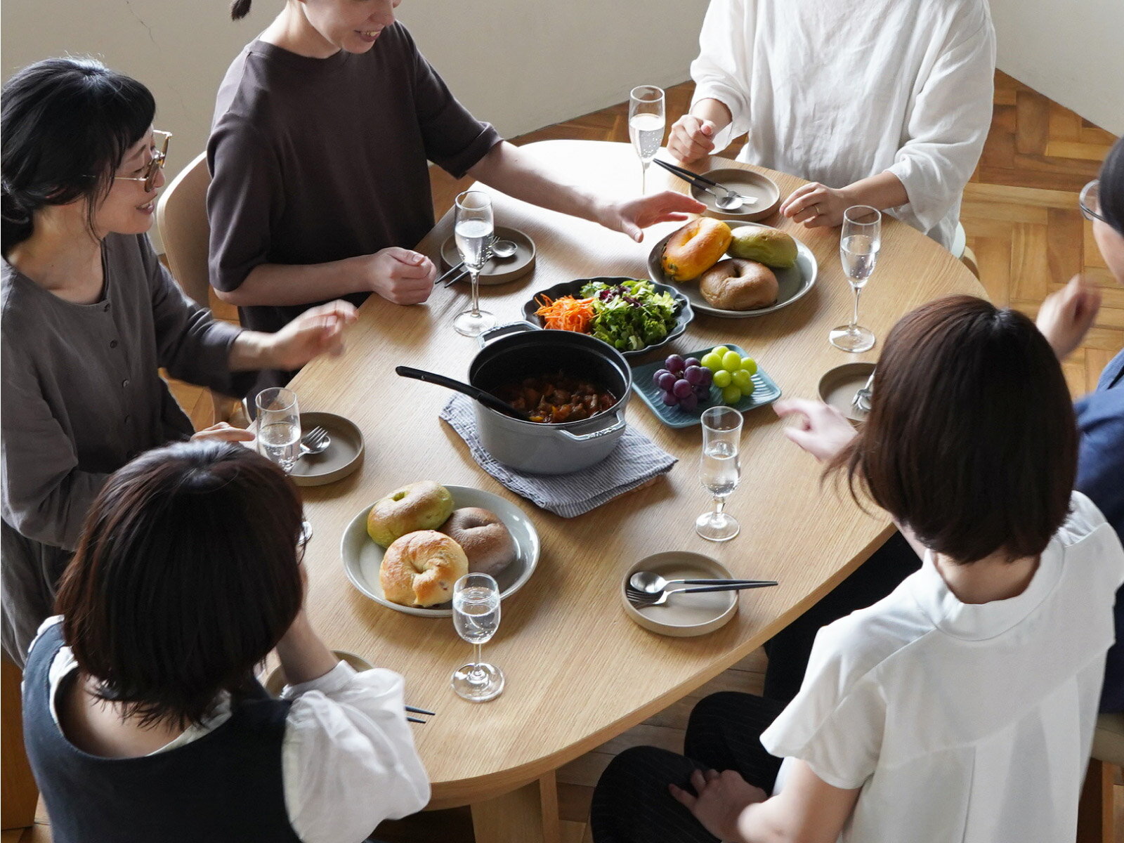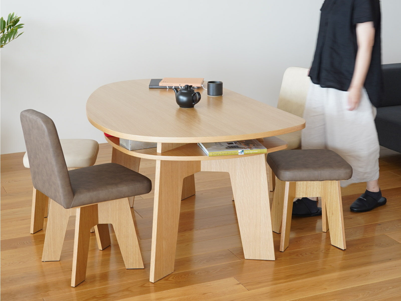 送料無料 ラッピング不可まぁるく囲んで会話が弾む SHUNO収納付き 変形ダイニングテーブルは、四角でも丸でも半円でもない、まさしく”変形”という言葉がぴったり。 半円よりも広く、四角よりも省スペース。 ありそうで無かったこの形は、他にはない優しく柔らかな印象を与えてくれます。 マンションやアパートのLDKなど、限られた空間を有効に使える! 角が無いため小さな子供が居ても安心! テーブルを自然と丸く囲むことが出来るので、家族の顔が見やすく会話が増えた! など、キナルユーザーから嬉しいご感想を多くいただいています。 この形がいい理由 さらに片面は直線になっていることで、壁付けや対面キッチンにつけることが出来ます。 ソファの背面や収納棚などに沿って、お部屋を柔らかく仕切るインテリアもおすすめ。 狭小住宅だけどダイニングテーブルを置きたいとお悩みの方にぴったりです! 普段は壁付け、来客の時には離して直線部分に座ってもらうことも出来るので 限られた空間の中でも色々な配置で楽しんでいただけるデザインです。 立たずに片付く優しいつくり パソコンを広げてお仕事したり、子供の宿題をみたり… 他にも子供のおもちゃ、読みかけの本や雑誌が置きっぱなしになってしまい テーブルを片付けるのも一苦労なんてことも。 ただ、すぐ使うものを仕舞い込んでしまうと、次に使う時に取り出すのが面倒ですよね。 そんな時にテーブルの下に収納があると、ささっと片付けられて、すぐに食事の支度を整えられる。 そして、食事が済んだらまたすぐに取り出せる。 忙しい日々のちょっとした手間が、とても快適に過ごせます。 想像以上の収納力 <収納したもの> 雑誌3冊、新聞3部、カトラリー、テーブルウェア、ノートパソコン1台(13インチ)、マウス、電卓、コード類 メモ帳・手帳、筆記道具、メガネケース、ティッシュケース、リモコン2個 こんなに沢山収納出来ました!まだまだ入りそうです。 細々したものは、それぞれケースに収めると散らばらずにスッキリ収納出来るのでおすすめです。 暮らしにあった空間づくり 四角のテーブルは角に座ることが難しいですが、角がないことでフレキシブルにお使いいただけます。 1人から6・7人でも囲むことができるデザインです。 2種の天板をご用意 通常天板は直線部分を壁付けにした際に右側が膨らむデザインとなっています。 天板反転は名前の通り、天板をひっくり返した形(反転させた形)となりますので 直線部分を壁付けにした際に左側が膨らむデザインとなります。 天板反転はお客様のご要望から誕生しました。 ドアの位置やお部屋のレイアウトによってお好みの形をお選びいただけたらと思います。 デザイナーと作り手 福井県の「おいしいキッチン」というプロジェクトから生まれたこのテーブル。 五十嵐久枝さんデザインの元、福井県にある「株式会社 福地」が制作しています。 2017年にプロジェクトが終了となりましたが、継続のご要望を多くいただいていたため このシリーズを引き継ぎ、キナルの製品として『やさしい暮らしーSHUNO(シュノ)』と新しく名付け、再スタートしました。(商品自体には変更はございません。) 丸みを帯びた他にないデザイン、こだわりの安全素材、日本製、コストを抑えた独自の製法、収納付きダイニングテーブルという特徴に加え、SHUNOに集う方々の笑顔が優しくなれるように、という意味が込められています。 素材・特性について 左からホワイトオーク・ホワイトアッシュ・ウォールナットの3色がございます。 SHUNOの表面には天然木突板を、芯材には昔から和家具に使われてきた丈夫で軽く腐食しにくい桐材を使用しています。 安価品などに見られるような木目のプリント仕上げでは楽しむことのできない、天然木の突板ならではの木の風合いを感じることができます。 そのため、一点一点表情が異なるのが特徴です。 天然木を使用している特性上、木目や色合いが揃うことはほぼございません。 自然に生まれた節や入り皮、木の模様、凹凸のある木肌が感じられます。(画像1・2・3) ※書き物をする際は下敷き等のご使用をオススメいたします。 オーク材の特徴として、縞模様で光沢のある斑がございます。 それが虎のお腹にある美しい毛並みに似ていることから 「虎斑(トラフ)」または「シルバークレイン」とも呼ばれ、「オーク材の証」として珍重されています。 トラフの入り方、木目、色は個々に異なり、一つの製品の中でも様々な表情が楽しめます。 天板に出る場合もございます。(画像4・5) 床の傷防止のため、初めから脚裏にフェルトが付いております。(画像6) 日頃のお手入れは固く絞ったふきんで拭いていただくだけで十分です。 表面にウレタン塗装を施しているため、溶剤等のご使用は色落ちや塗装が剥がれる原因となります。 予めご理解ご了承いただけますと幸いです。 サイズ・組み立て方法 脚はまっすぐではなく斜めに付いているのがポイント。 斜めに付い