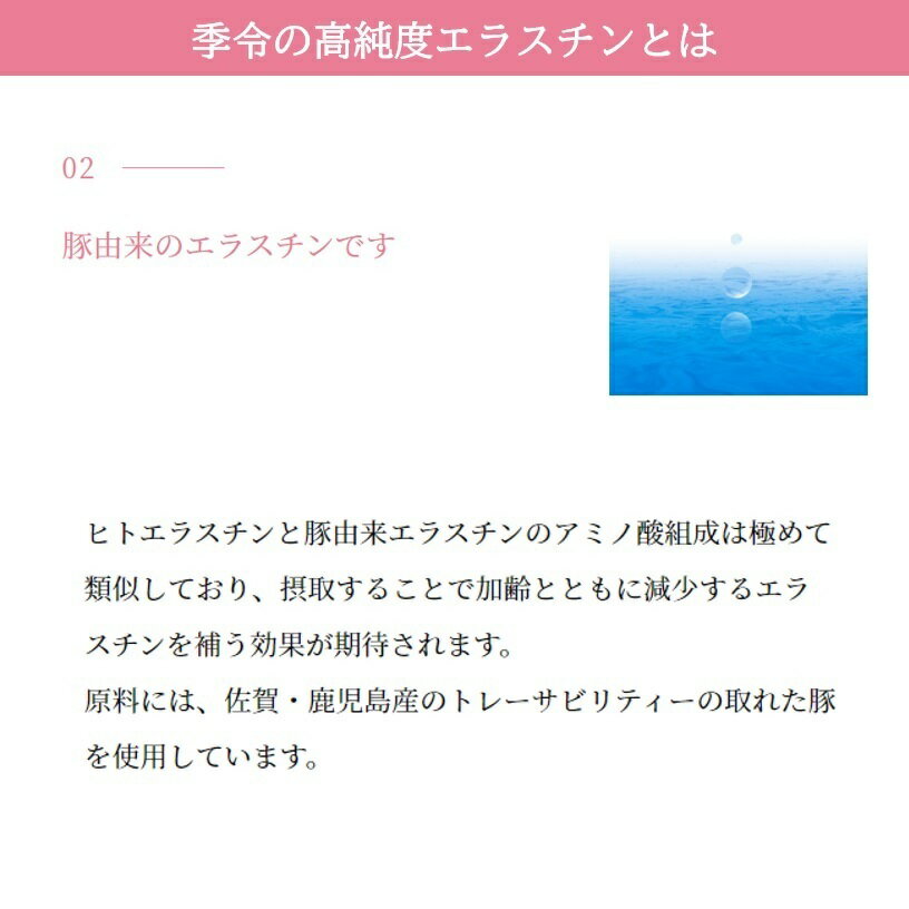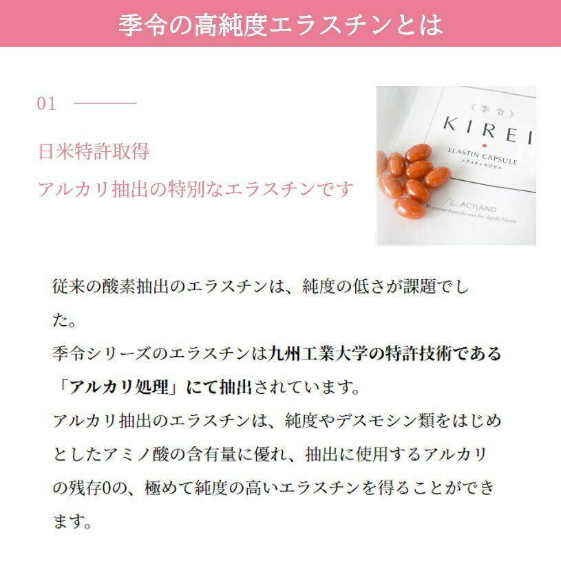 季令 KIREI モイスチャーゲル オールインワンゲル 100ml これ1本で化粧水、乳液、美容液、クリームの役目を果たします。 1ステップで効果的なエイジングケアを望む方にお届けする高純度エラスチンオールインワンゲル。これ1本で化粧水、乳液、美容液、クリームの役目を果たします。弊社が誇る高純度エラスチンの効果を最大限に引き出す処方を研究の末誕生しました。98%天然由来の成分で作られており、植物幹細胞が肌への優しさと肌効果を同時にかなえます。高純度エラスチンの働きをより高める植物エキスを配合し、健やかなターンオーバーの手助けをします。紫外線や乾燥といった外的環境から受けるダメージから肌を守り、保湿、美白だけでなく、年齢肌のハリ・弾力・しわ・たるみのケアがこれ一本でかないます。また、パックやバストケアとしても使えるすぐれものです。 2