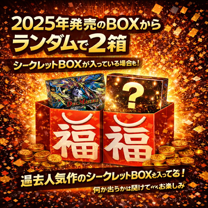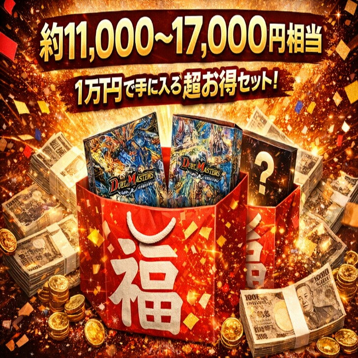 【福袋】デュエル・マスターズ TCG 超お得BOX2箱セット 超お得 福袋 新品 未開封品 デュエマ トレカ トレーディングカード デュエマ好き必見!2025年発売の新品・未開封BOX2箱セットの超お得福袋です。お一人様1点限り。数量限定30個販売です。売り切れ次第、販売終了となります。総額以上の可能性あり?約11,000円~17,000円相当が1万円で手に入る!何が入るかは開けてからのお楽しみ!シークレット枠として、今では手に入らない超刺激的な過去人気作品のBOXも封入!?2025年BOXの最新感と、過去人気BOXのレア感、両方を一度に味わえるのはこのセットだけ。デュエル・マスターズをもっと楽しみたいあなたへ。コレクターもプレイヤーも満足のBOXセットです。■こんな方におすすめ・コレクターで、未知のBOXとの出会いを楽しみたい方・プレイヤーで、最新BOX+過去BOXでデッキ構築の幅を広げたい方・価格以上の価値を狙いたい、福袋好きの方*12月30日以降の注文は1月4日以降に順次発送いたします。*沖縄・離島は発送不可商品です。 2